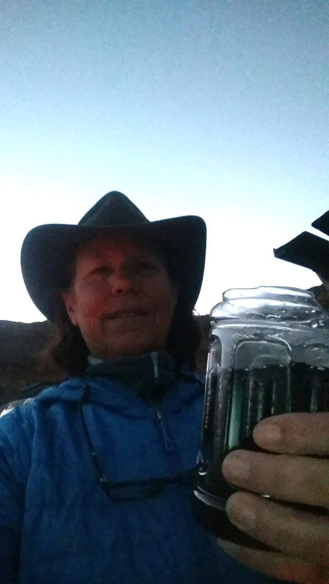 The evening’s air was blissfully “warm”, which allowed us to actually enjoy our evening’s campfire and the remainder of our adult beverages in improvised “cups”.