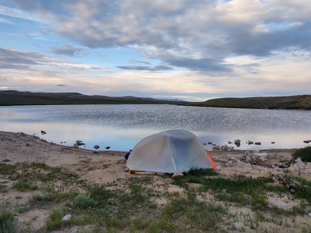 When we arrived, and walked up the side road to the reservoir, we flushed a dozen or more of what initially appeared to be “super chickens”, or grouse on steroids. A family was fishing at its base, and said that the Fish and Game has stocked it with rainbow trout the day before. As we were scouting for a place to set up our tent, the family packed up and left. Was it something we said? Or maybe the smell?…the wind WAS blowing in their direction.