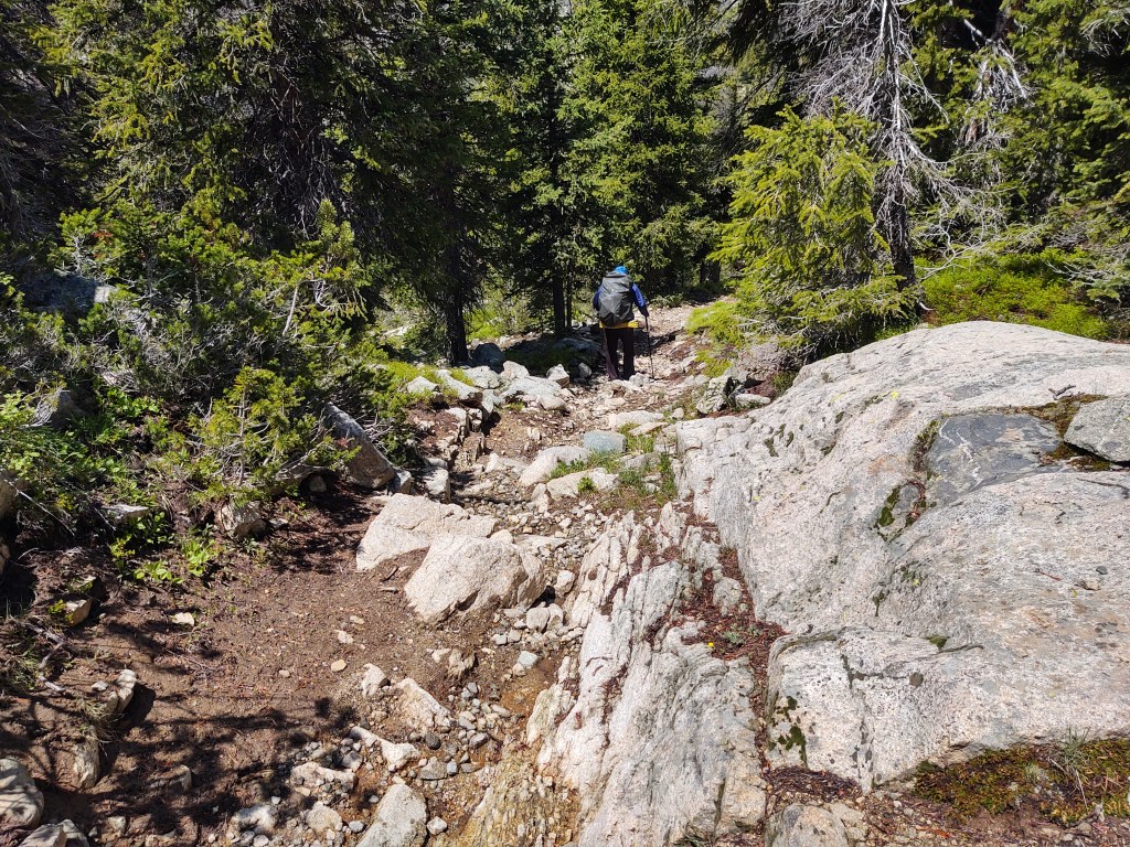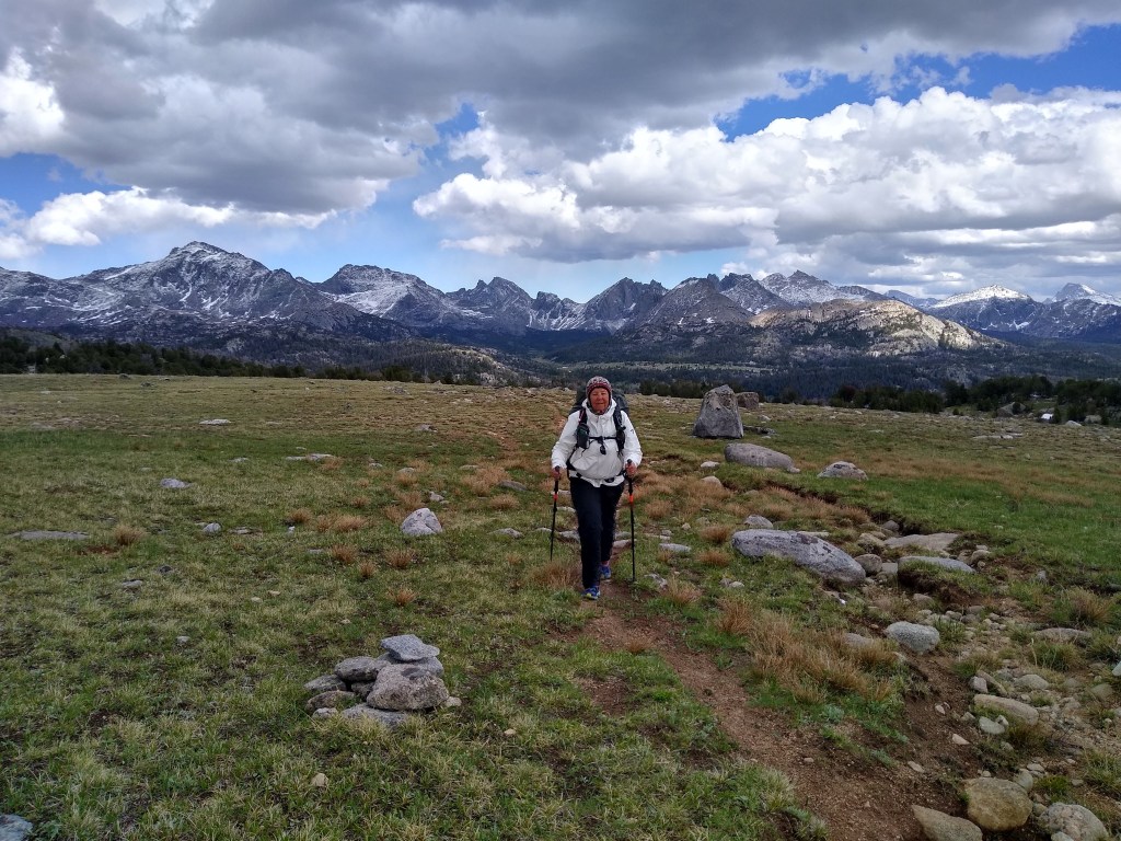 We left Meeks lake knowing we had a day of climbing (elevation gain). The skies threatened us constantly, and we eventually switched to our rain jackets. If anything, it helped buffet us against the wind.