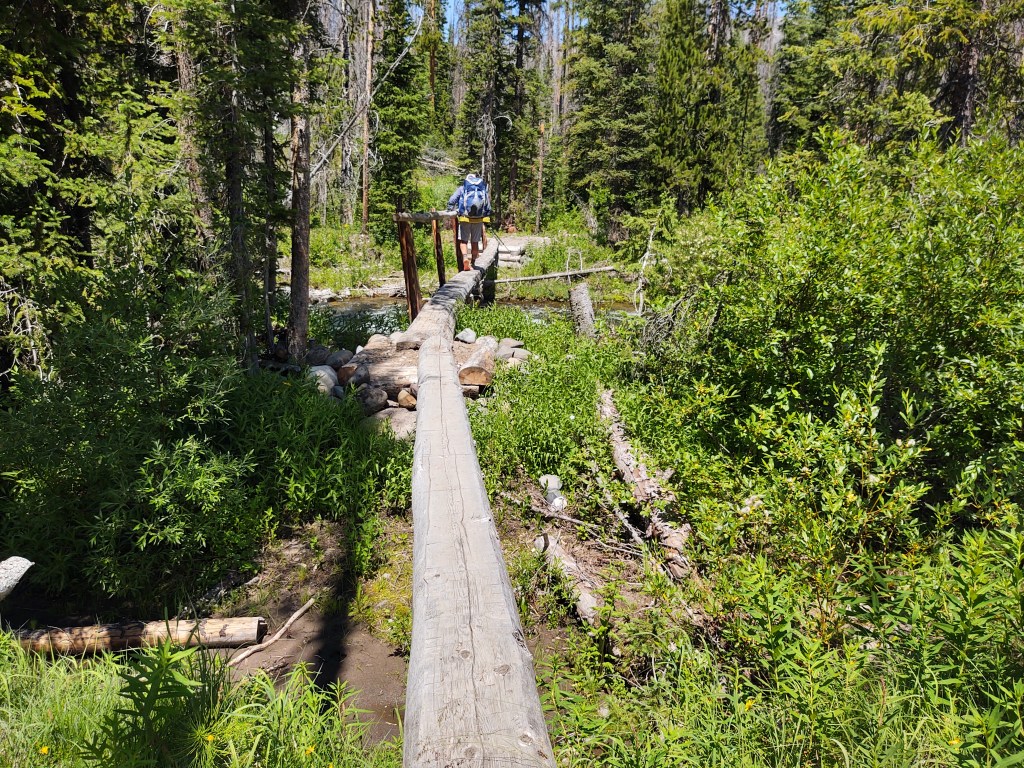 As we were packing up, Chimp and Raindance arrived. They started well after us the day prior and ended up camping only 3 miles from us. We weren’t surprised, as they are pretty fast as it is. This is their second time hiking the CDT, and this time they said they were “not in any hurry” as being from the UK, they can’t go home anyways. We watched as they deftly removed their shoes, socks and inserts from their shoes, all while still wearing their tiny little packs. With most river crossings they do this as they find by removing their shoes inserts and socks, their shoes dry faster and their socks stay drier and last longer. Before they crossed, Raindance pulled out a small container that Liz had given them before they left. It was Liz’s special arnica salve. Raindance had graciously offered to deliver it to us. For Raindance to carry something “extra” in her pack is pretty special. We were grateful for both her and Liz’s thoughtfulness. Paul would end up reluctantly using the salve at the end of the day, after having seriously rolled his ankle.