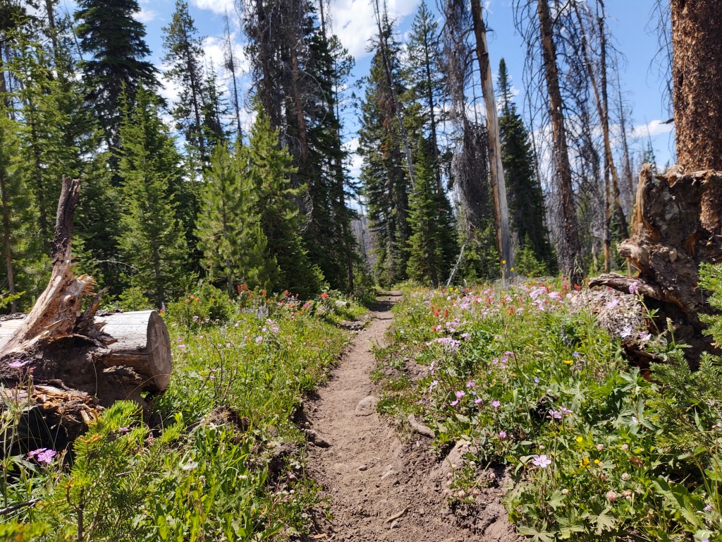 The day was expressly warm and dry, so having wet feet initially wasn’t that bad. Compared to our previous week’s trail tread, this tread was glorious. Almost like walking on carpet. It was obvious that a fiercely hot fire had burned through the area we walked, as no new growth could be seen, but an ever expanding meadow was overtaking a previously thick stand of trees.