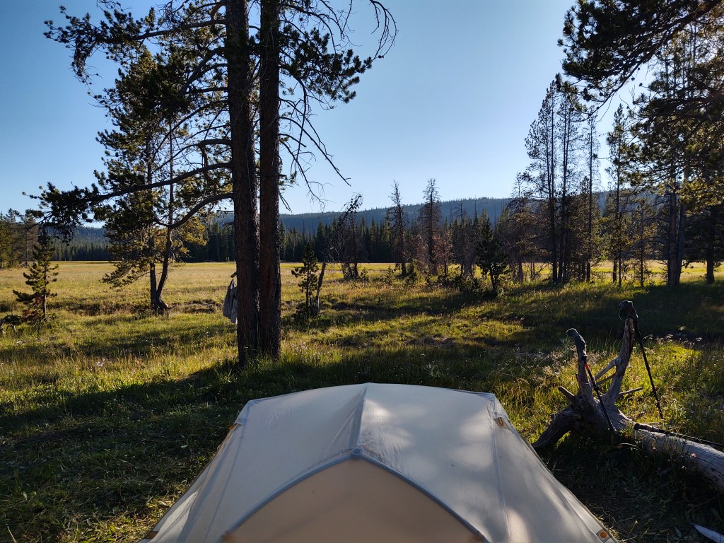 We arrived at our assigned camp. We had it all to ourselves. We bathed in the Firehole Creek that meandered by our site. It was pleasantly on the warm side, and a brisk and sustained breeze kept the bugs at bay. We ate an “early” dinner and then retreated to the safety of our tent while hoards of mosquitos “paced” outside the fine mesh enclosure.