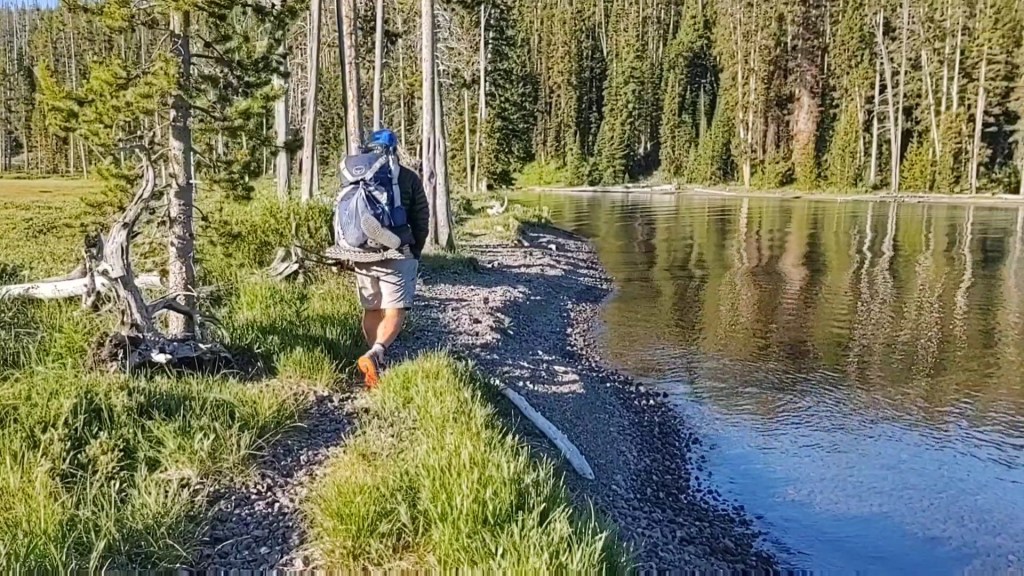 Bright and early we left our campsite at Shoshone Lake (S01). The trail turned toward the shoreline that consists of golf ball sized volcanic rock.