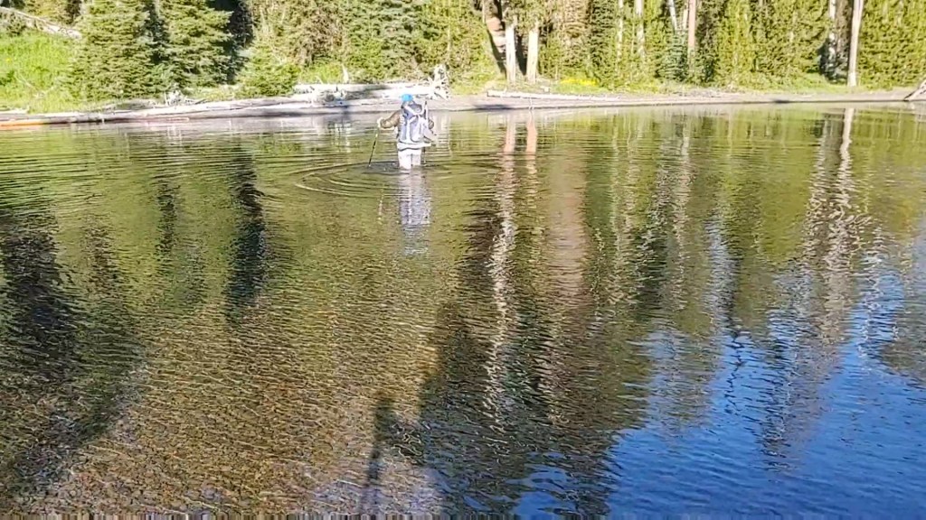 After a thigh deep crossing in calm water, we spent the next 40 minutes exploring the “trail to our right and the trail to our left. Neither one showed us anywhere on the redline, that is the CDT. What Guthook and our Garmin inReach showed us, was that we were absolutely “off trail”. The left one definitely did NOT go in the direction we wanted to go. The “right” trail became the final option. We were prepared to bushwack if necessary to get back on trail. Luckily the “right” one eventually fed onto the CDT. As “usual”, we figure we’re not on the CDT unless we get lost or have to backtrack at least once a day.