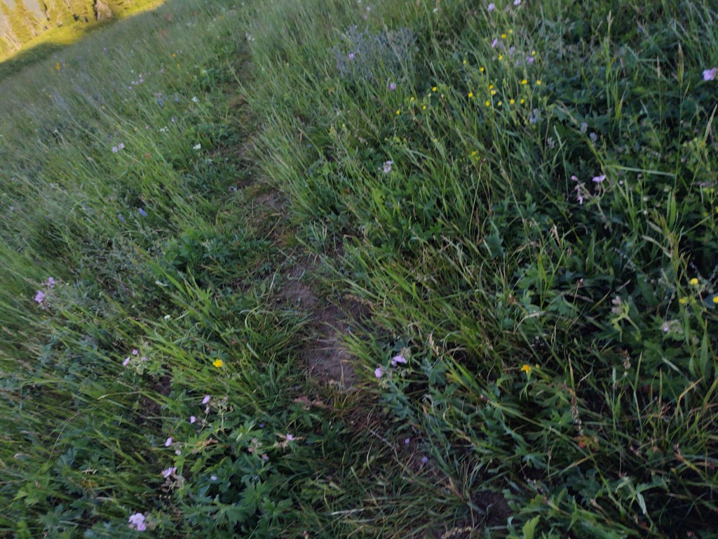 The problem is that the “old” route is still marked with US Forest Service CDT trail marker signs, and is, well, “shorter” and well tread upon, as opposed to the new route. Had we not missed the turnoff to the new route, by a mile, we would have taken the new route. As it was, portions of the “old” route weren’t particularly fun as it was fraught with “Land Mines”. “Land Mines”, for me, are soft portions of soil from recently “filled” holes and/or enormous gopher or badger holes that are obscured from view via tall grass and thick vegetation, that lie directly in the path of the trail. As my luck would have it, I rolled my left ankle in not one, but several of them as we walked “blindly” along, during a hillside traverse. Better that this happened toward the end of the day, rather than its beginning, and that the route’s views were still stunning.