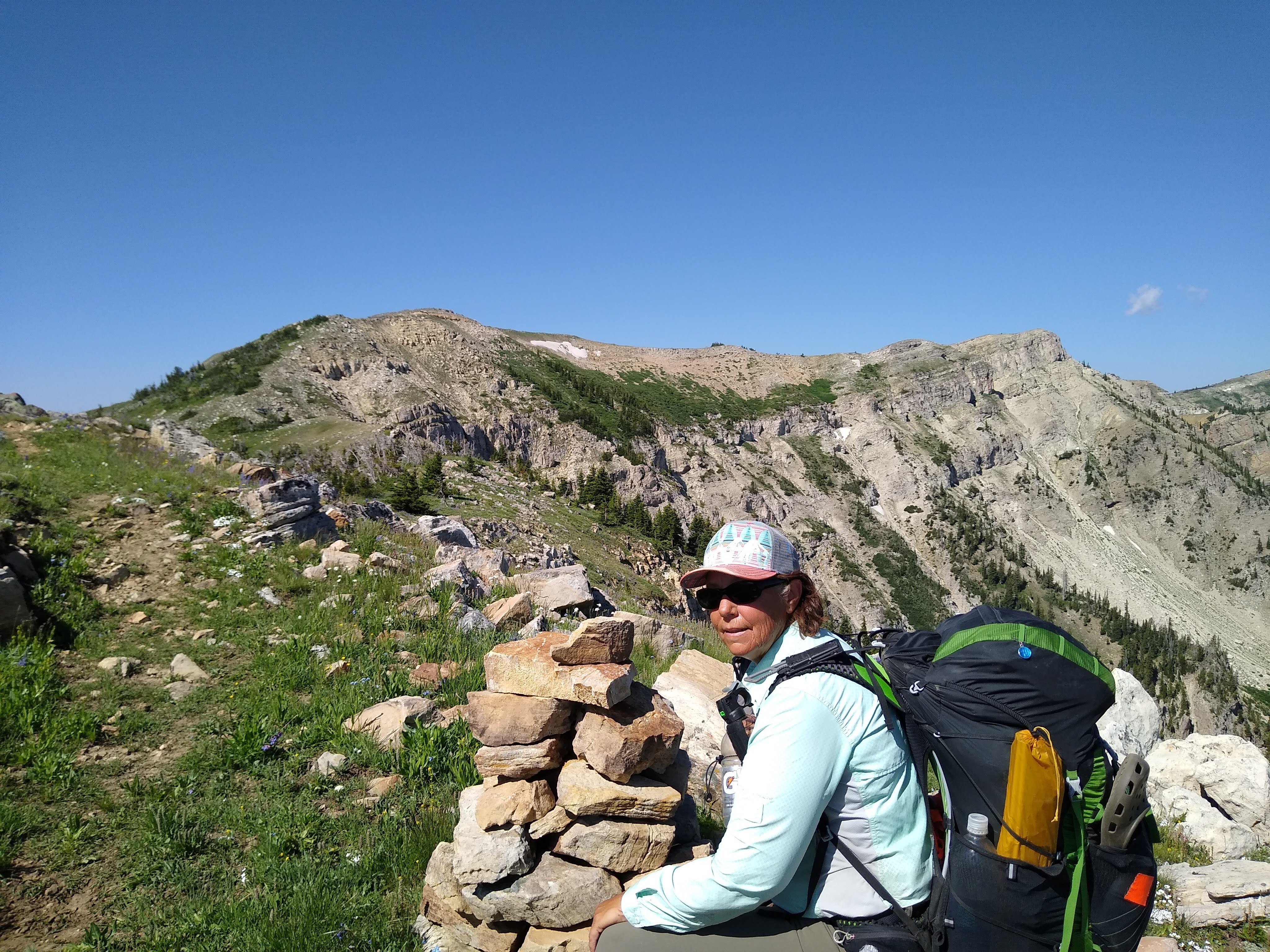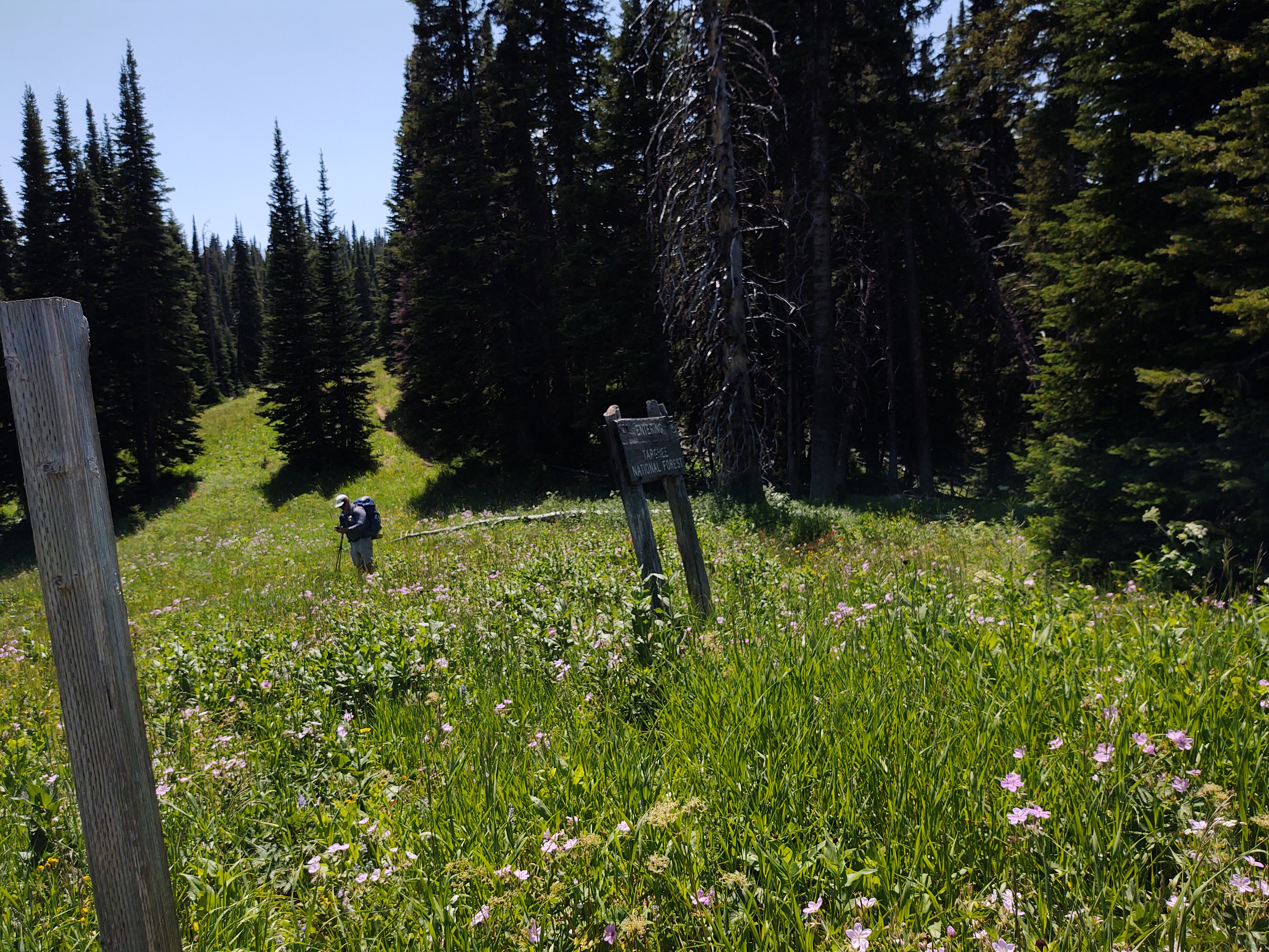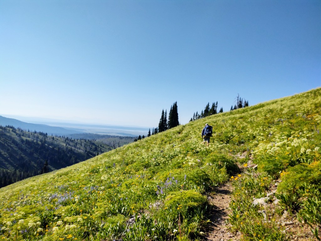 Flowers. Ridgelines. Clear skies. Being in two states at the same time (Idaho/Montana). A relatively “flat” stretch of trail with expansive views. Yup. The eyes had the legs and lungs doing its bidding, for a change. We spent a good portion of the morning and early afternoon at over 9,000 feet. Once we got to 9,000 feet, the trail followed what appeared to be a once used, and obviously hearty, graded road.