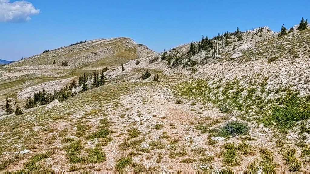 After the switchbacks, and a few miles after you pass a Targhee National Forest sign, the trail narrows. At one point the trail forks into two CDT routes. The “new” reroute of the CDT as shown on Guthook, but poorly marked, and the previously marked and “old” route. The “new” route seems to have been purposely rerouted to pass by a spring, that one used to have to bushwhack 2/10th of a mile off trail, to access it. With this reroute, it significantly reduces the mostly shade-less 17 mile water carry.
