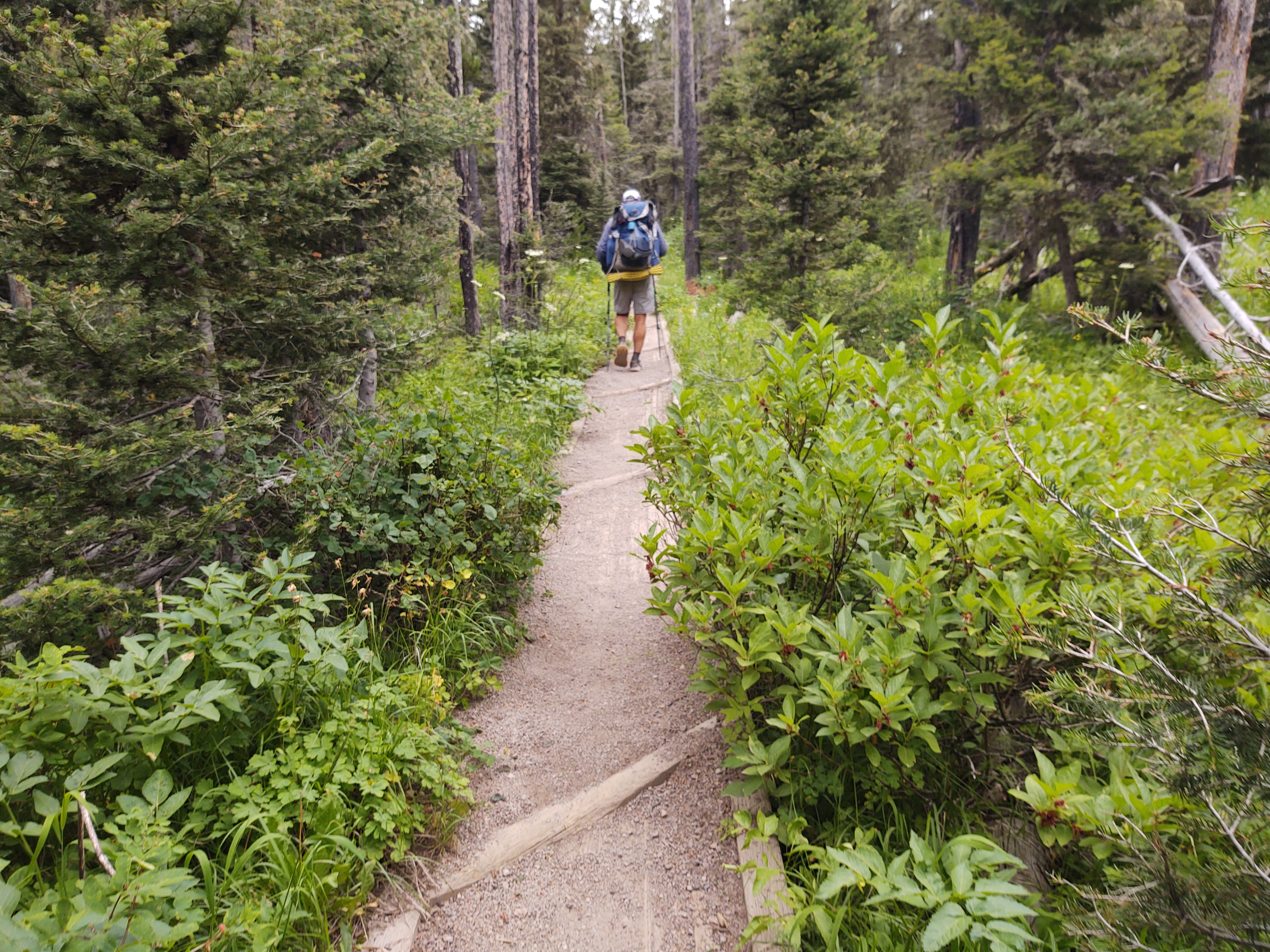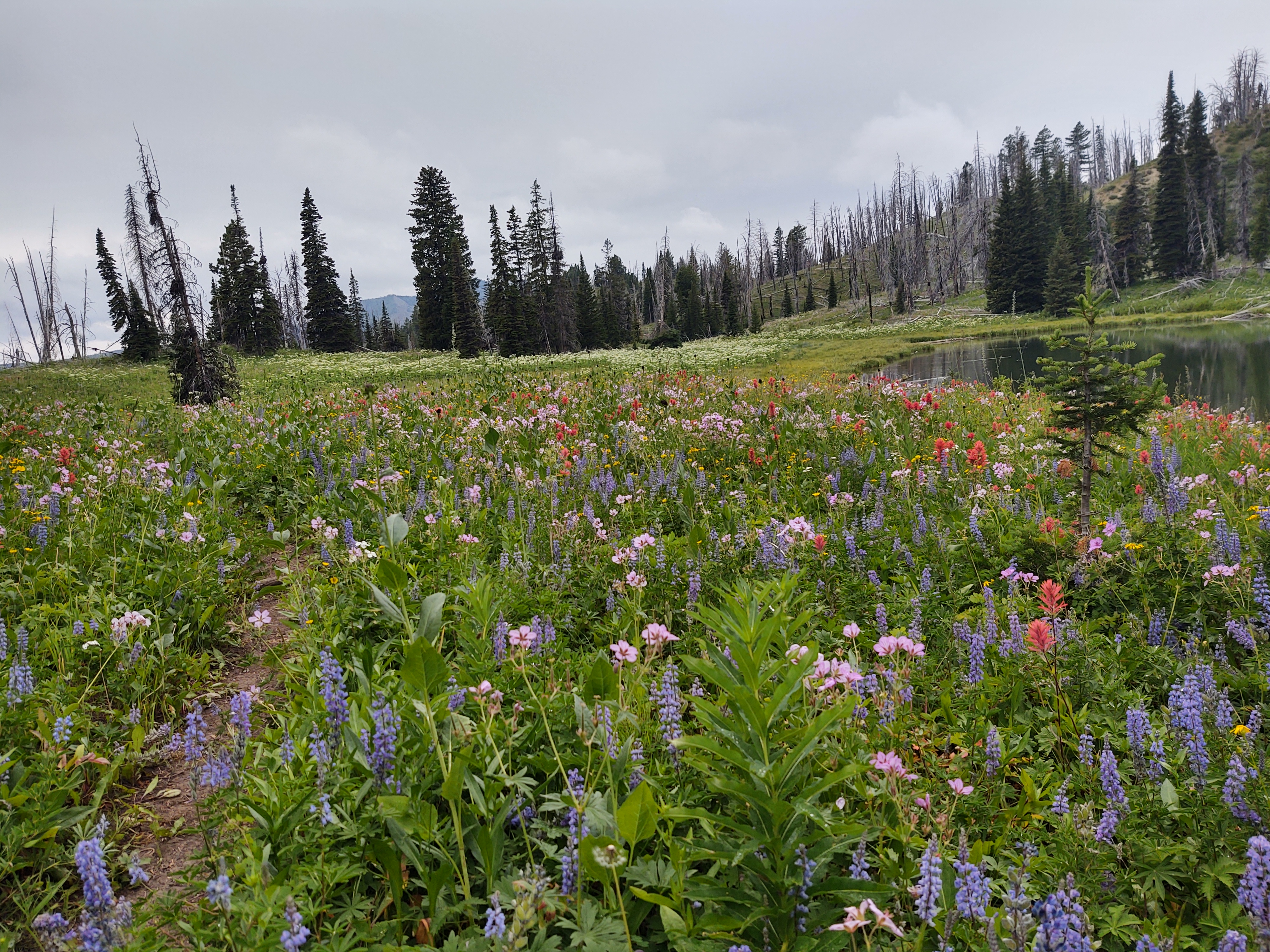 Once over a narrow saddle, we passed small lakes and ponds fed by seeping springs. Parts of the trail degraded into boggy messes that we tried to tiptoe around and through. However, lush vegetation and colorful live bouquets of flowers surrounded us and the trail.