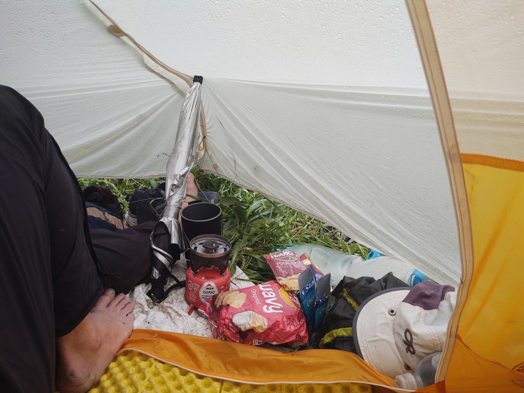 By the time Paul entered the tent, I had already fished out our clothes bags from our packs and was in the process of stripping down, and putting on my thermals. Even without Paul now in the tent, putting on anything dry is incredibly hard to do, in a cramped space, with sticky wet skin and fumble fingers.