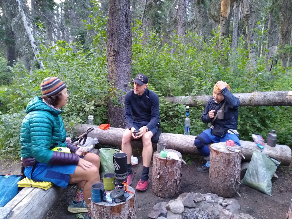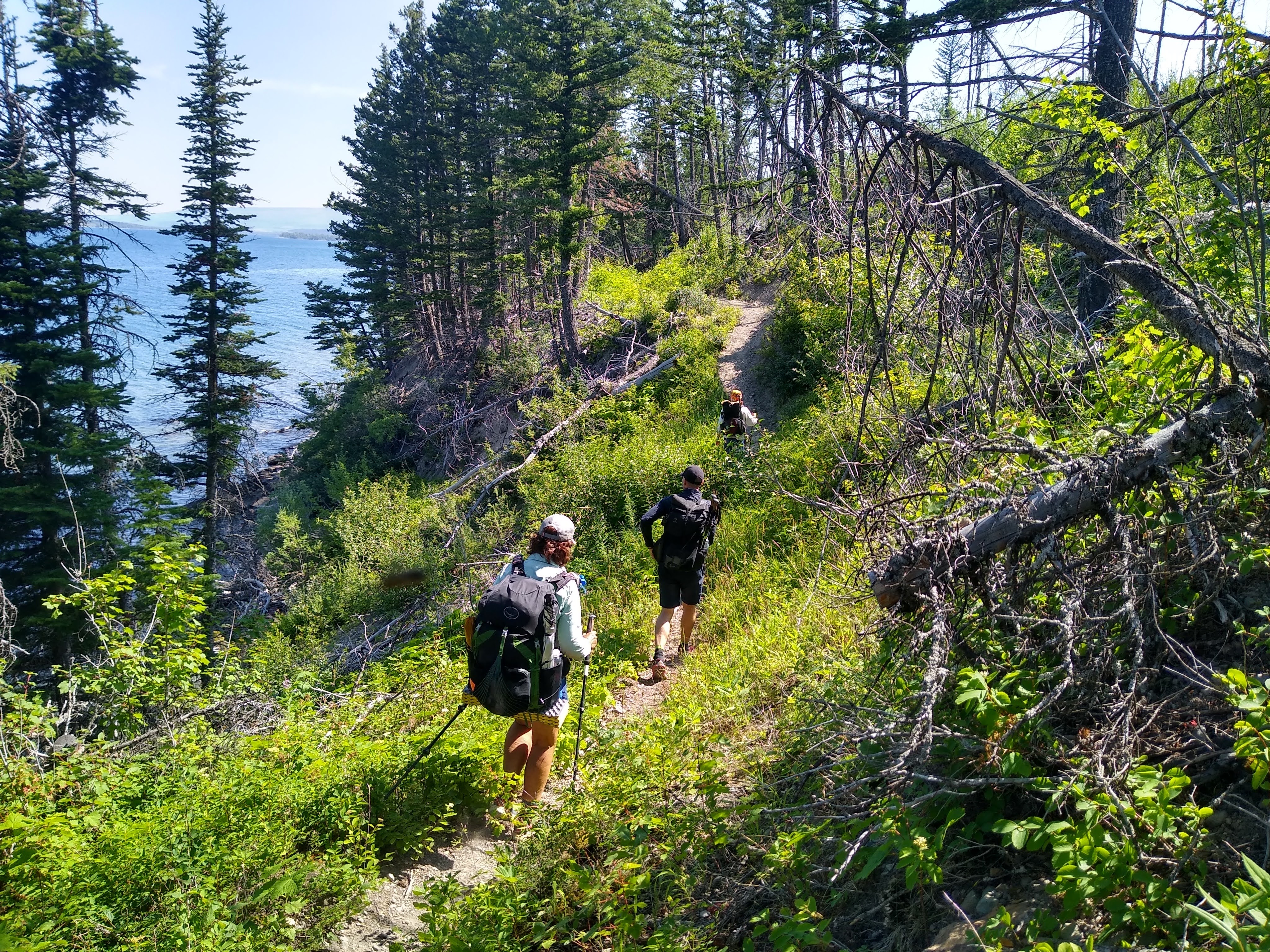 No matter how hard we tried to “milk” the miles, we made it to Reynolds Lake by 3:30pm. Hotter than hot (high 90’s) we all had a swim…fully clothed, while Hobbit (who can’t swim) decided it was a good idea to test his bear spray…in the warm wind. And yes, what one would expect to happen in such conditions did. Hobbit’s response, when we asked him how it felt, “It is very spicey”, with his eyes still watering and barely open. We all had a good laugh as we lounged on the lake’s shore rummaging through our snacks, and sampling the wild onion that sprouted upon it’s shore.