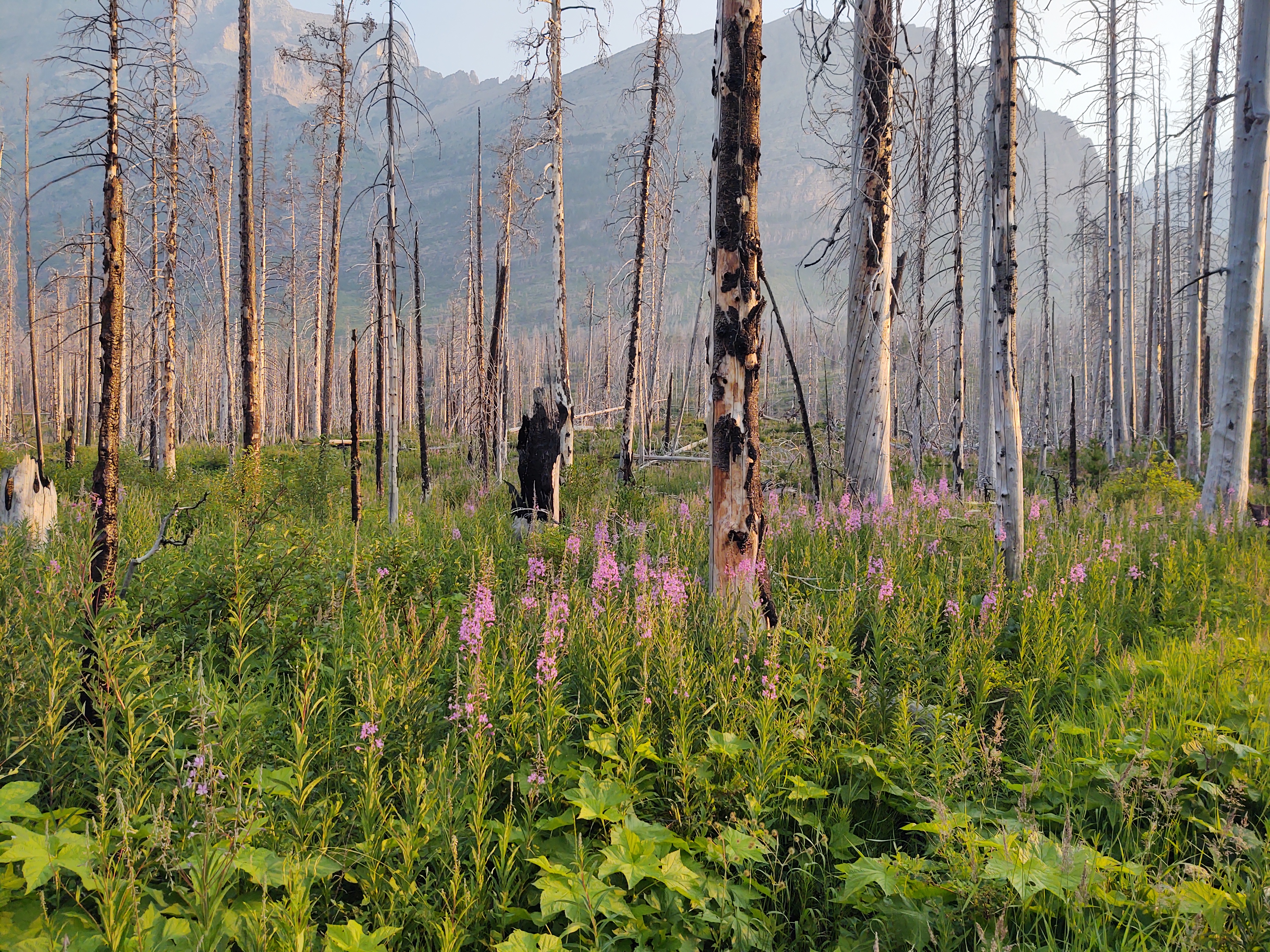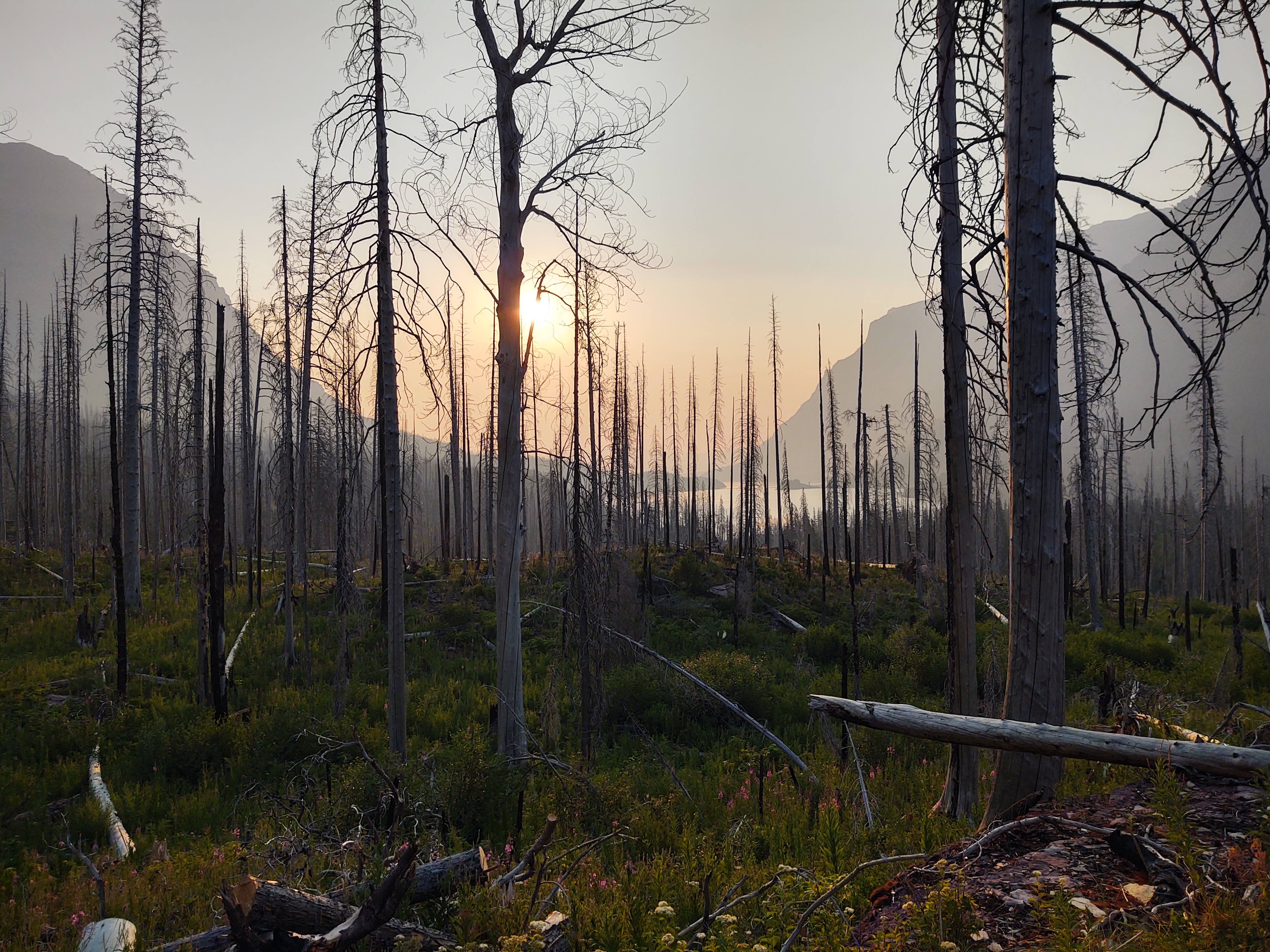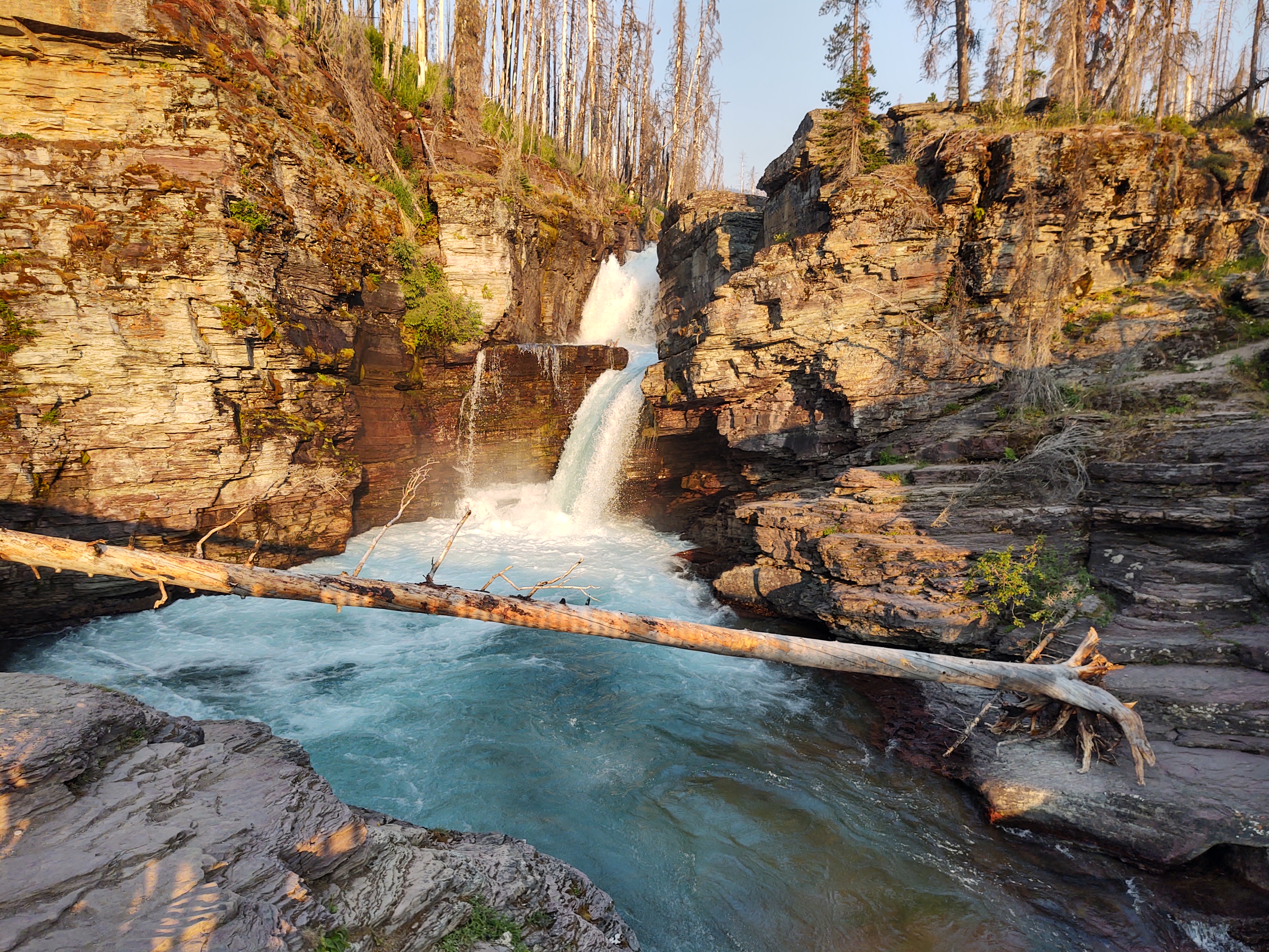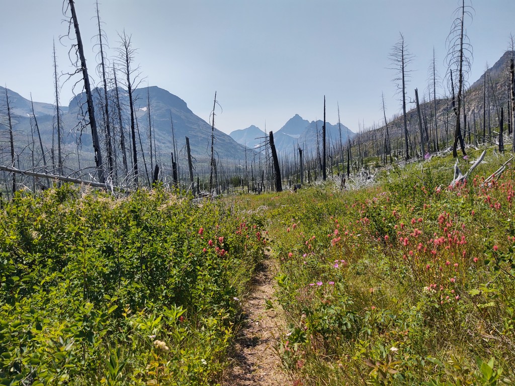 Yup. Burnt forest, waterfalls and a walk around/above St. Mary Lake, (that, by the way is ENORMOUS!) was the norm for this day.