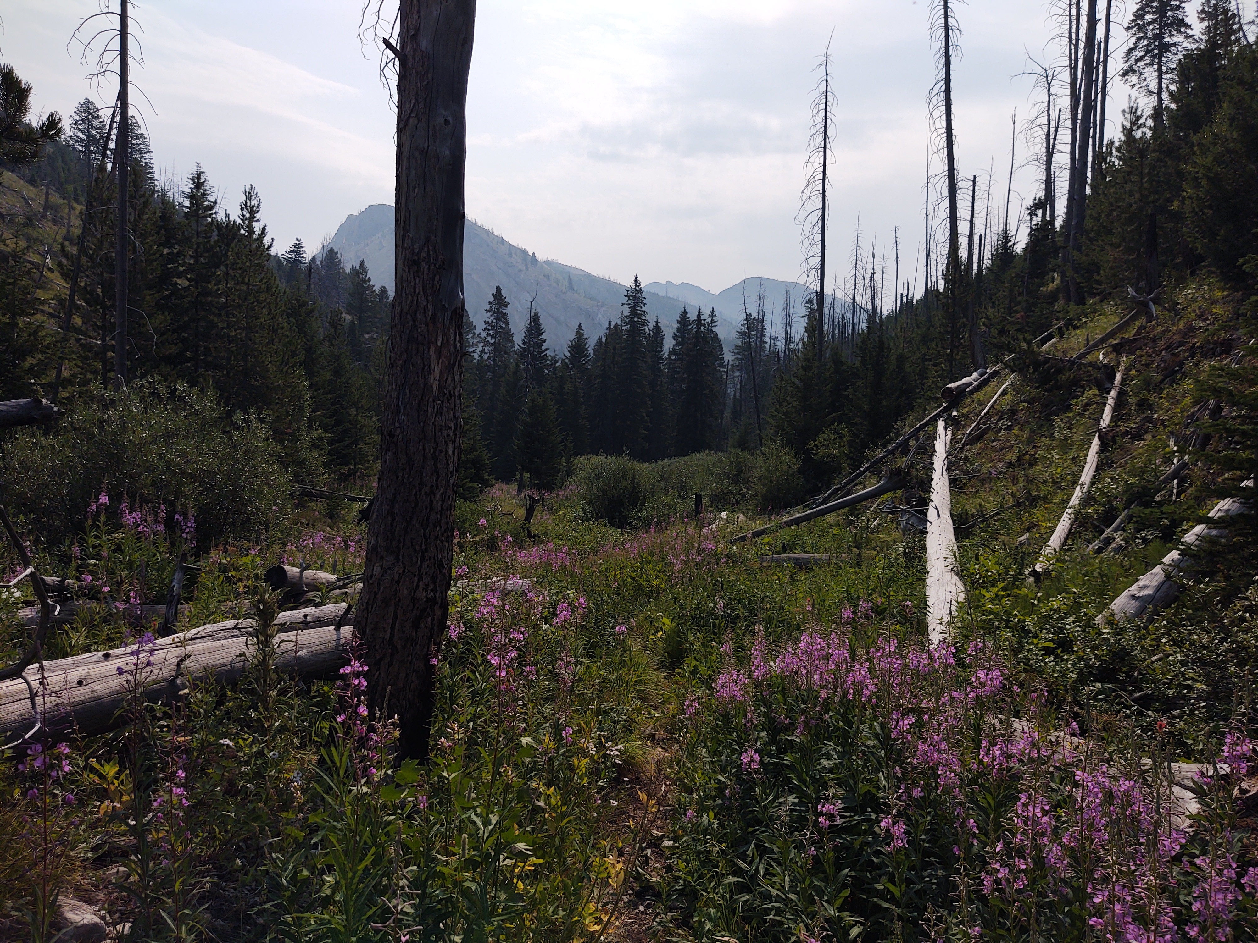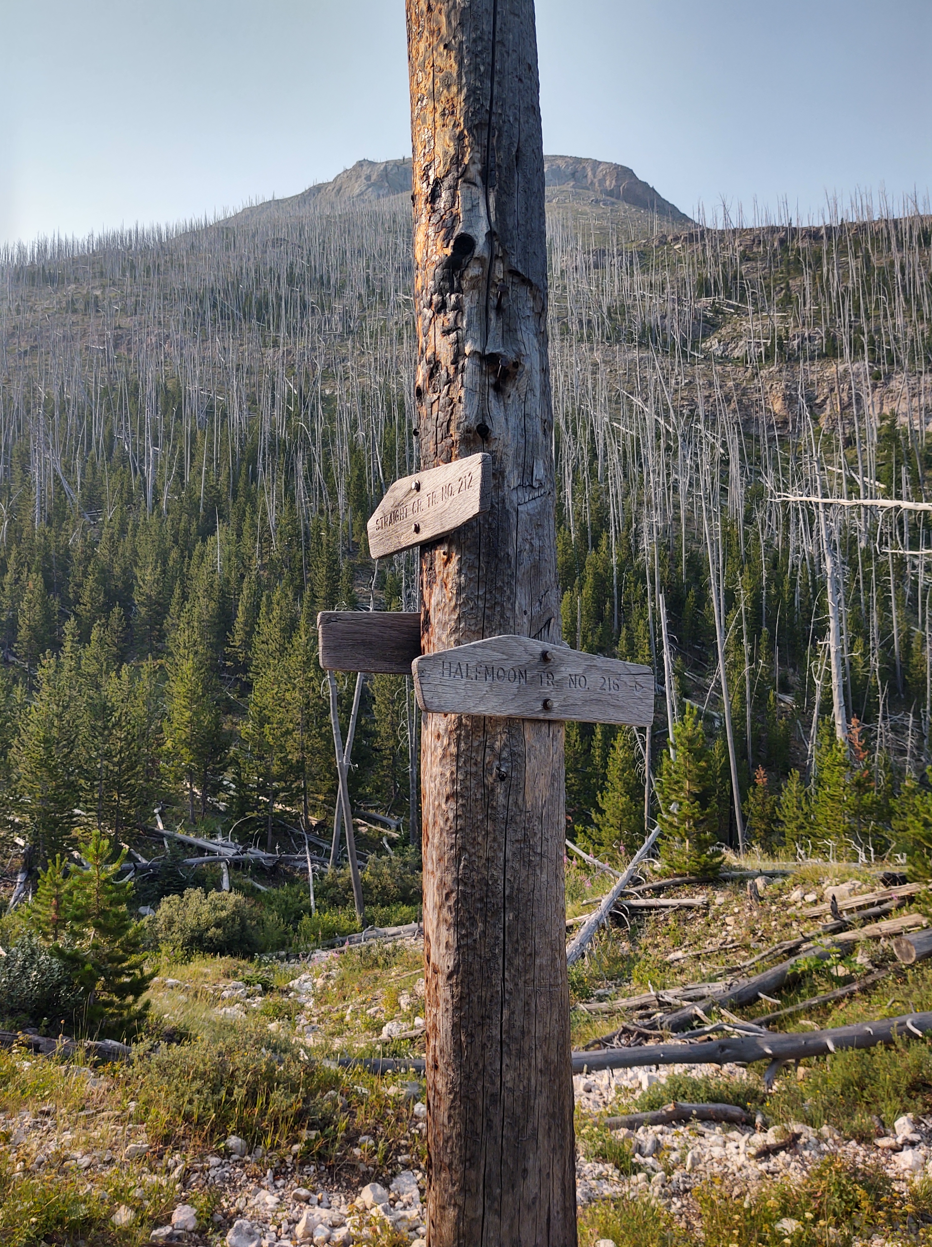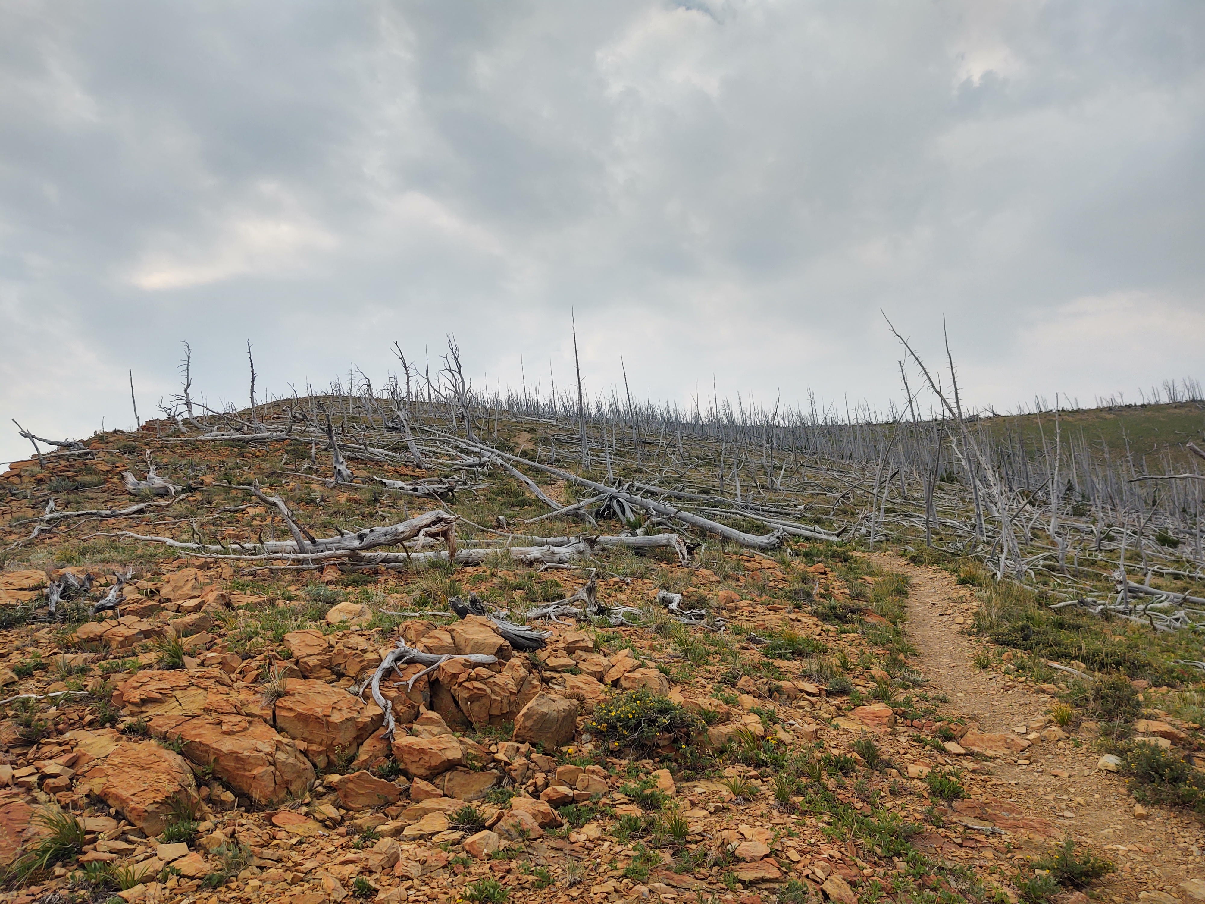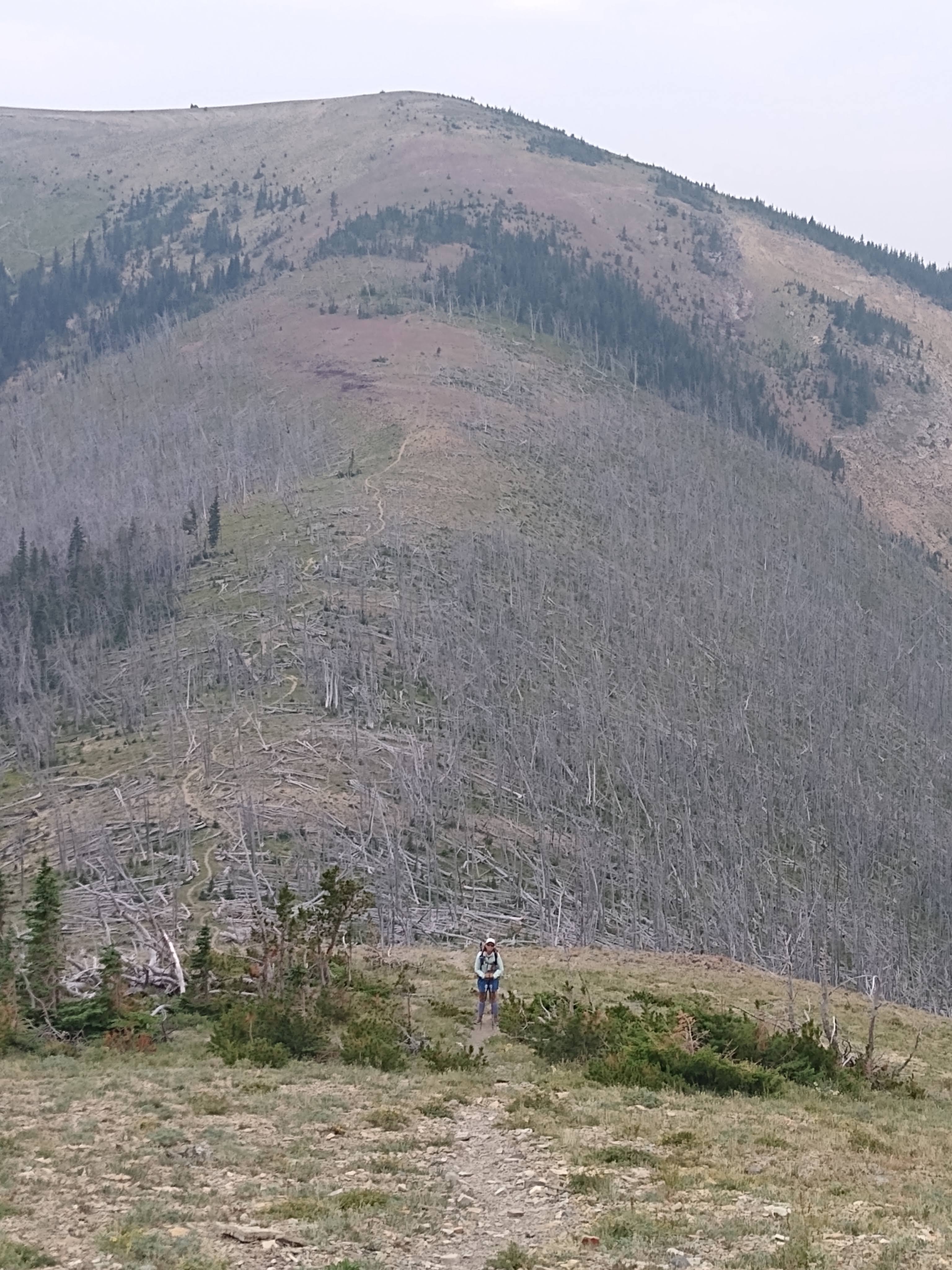 We knew that forward of our campsite lie the skeletal remains of a forest fire some 30 years ago. “Widowmakers” everywhere! We were glad we didn’t have to walk or make camp anywhere near these brittle trees. Oddly enough, while eating our rehydrated dinner, and after the wind had ceased to blow, a tree suddenly collapsed, mid trunk and fell some 50yds from where we were. Tent placement is ever so important in dead fall areas.