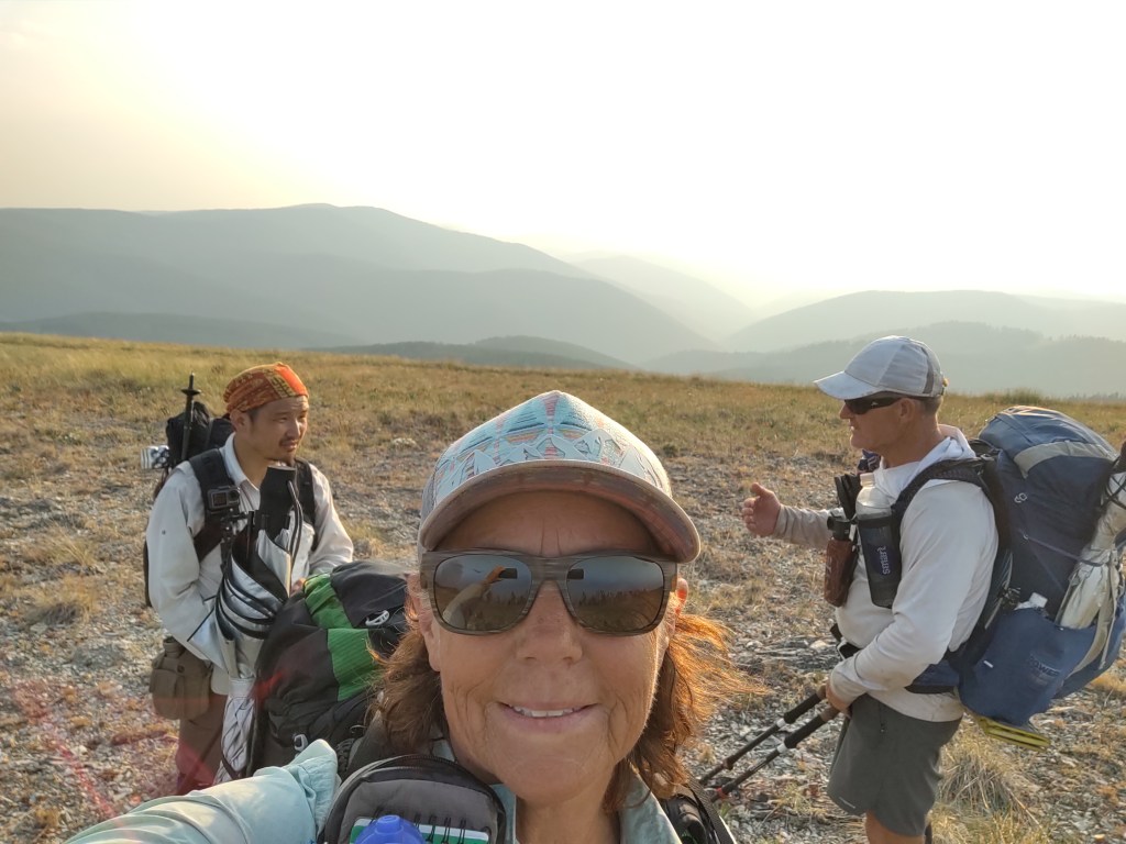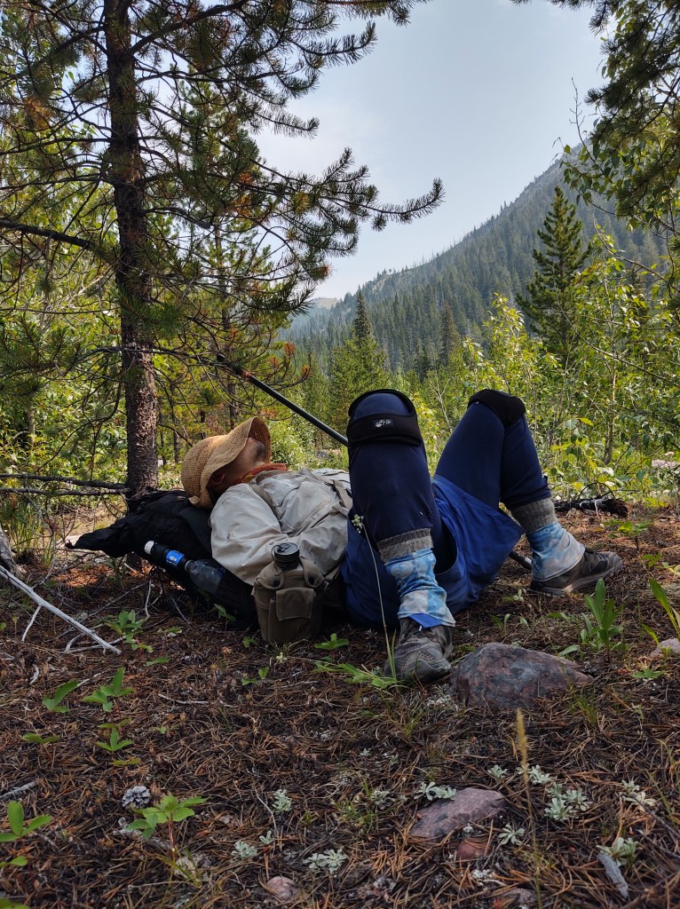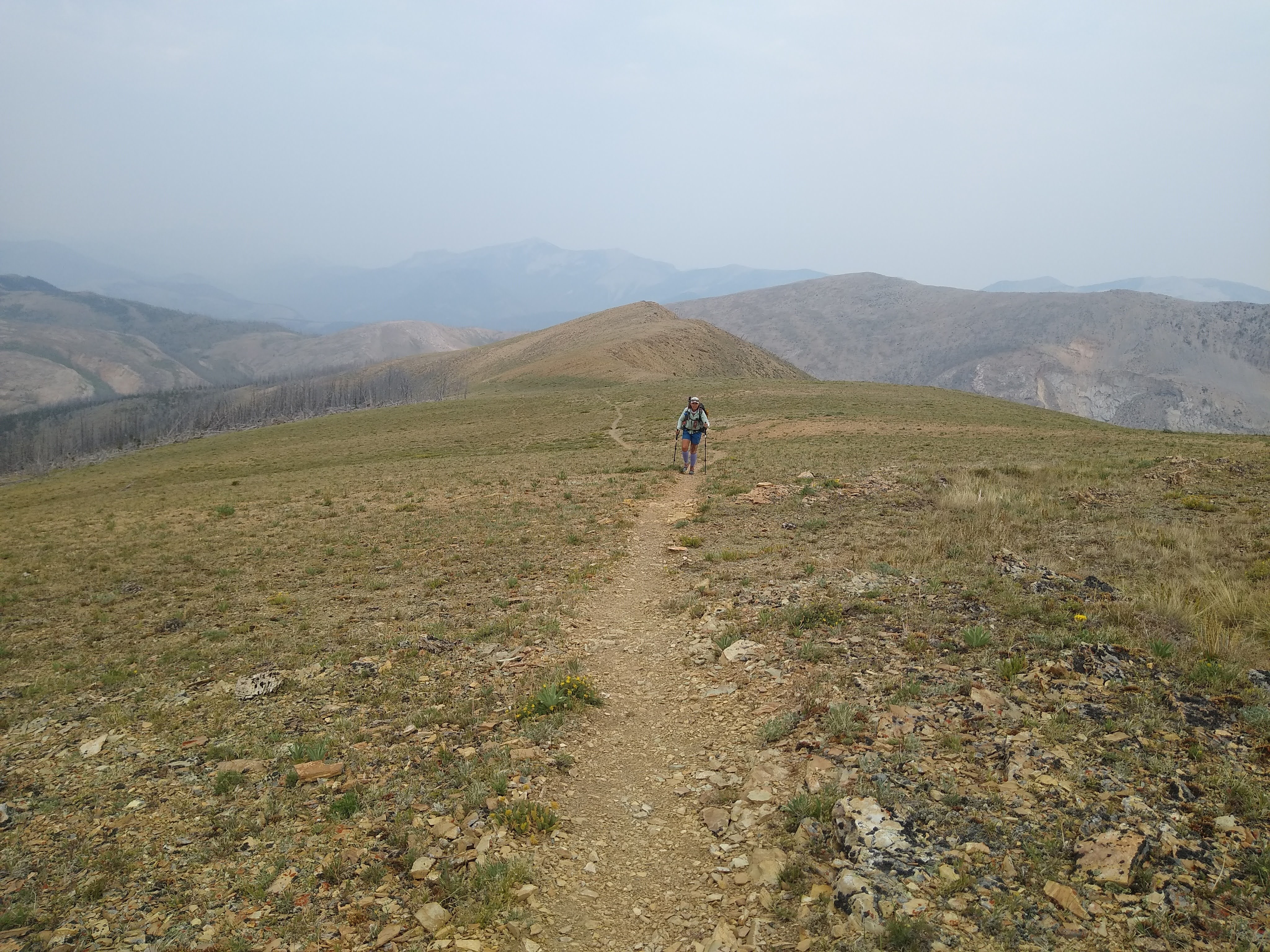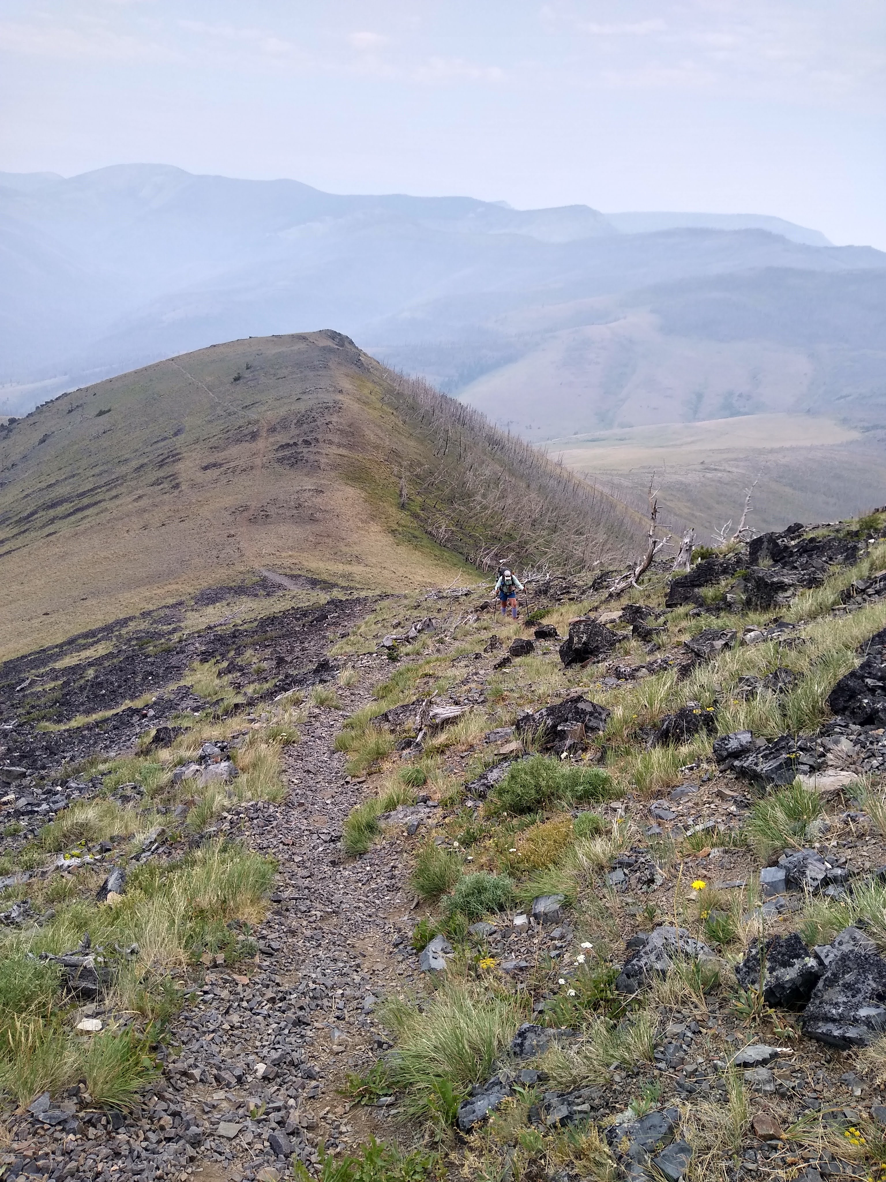 And as if it couldn’t get any better, who should appear, just as we were fully satiated, and preparing to head out back on the trail (after a hour and a half of food and trail talk), but Hobbit! There was no mistaking the jingle of his bear bell, or his stature. We thought we probably would not see him again. From Dearborne River his intent was to skedaddle 28 miles to Rogers Pass and hitch into Lincoln for a zero day to resupply, eat town food, and sleep in a bed. Somehow he did a one day turn around and got dropped off (unintentionally) at Flesher Pass.