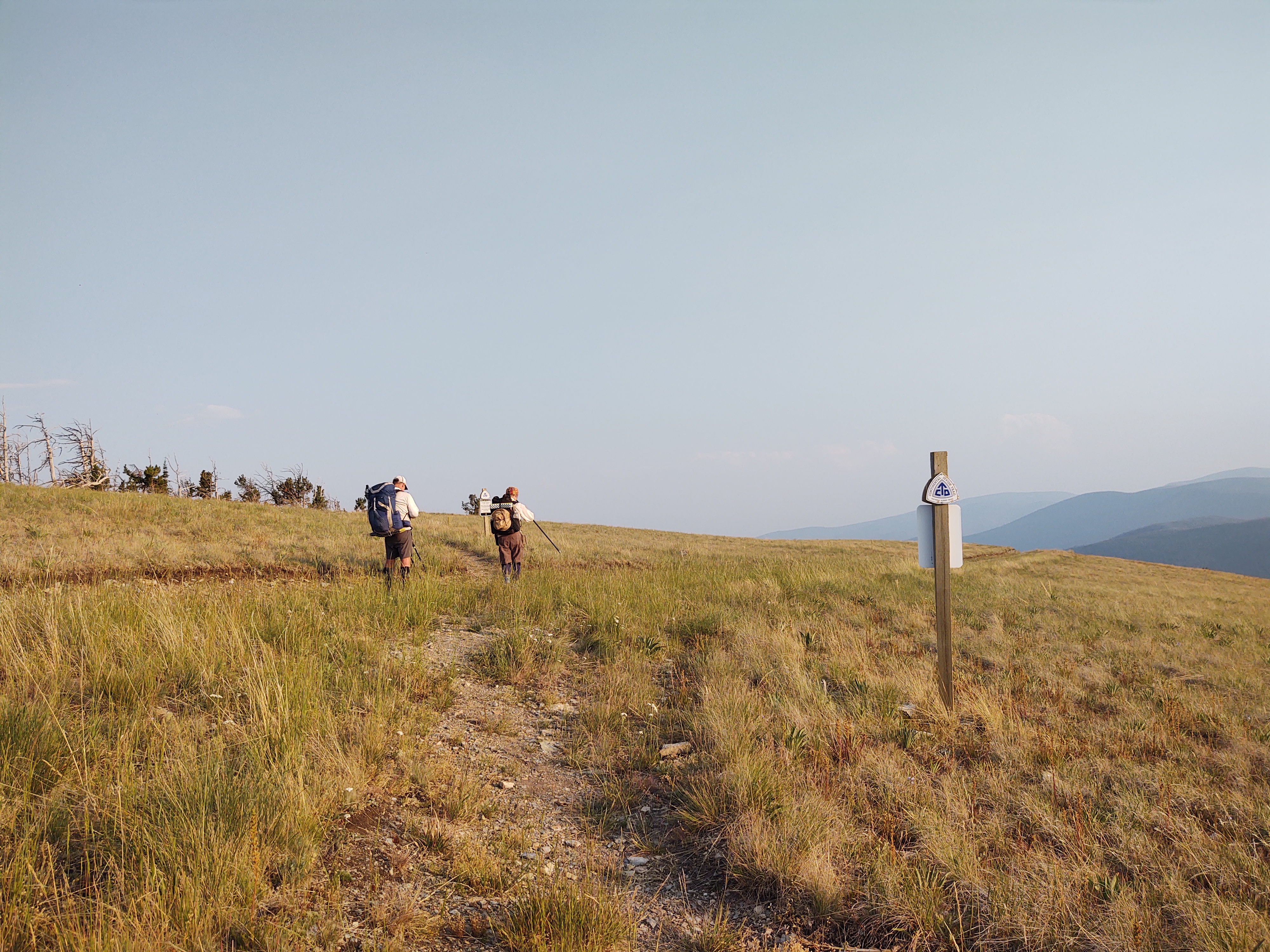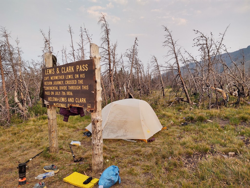 By the time we (I) made it to the Lewis & Clark Pass, it was 8pm. I set up camp, just behind the sign marking the historic spot, while Paul foraged for the reported spring, which he described as “a pain in the ass” to get to, but absolutely necessary. A glowing sunset rounded out our exhausting day.