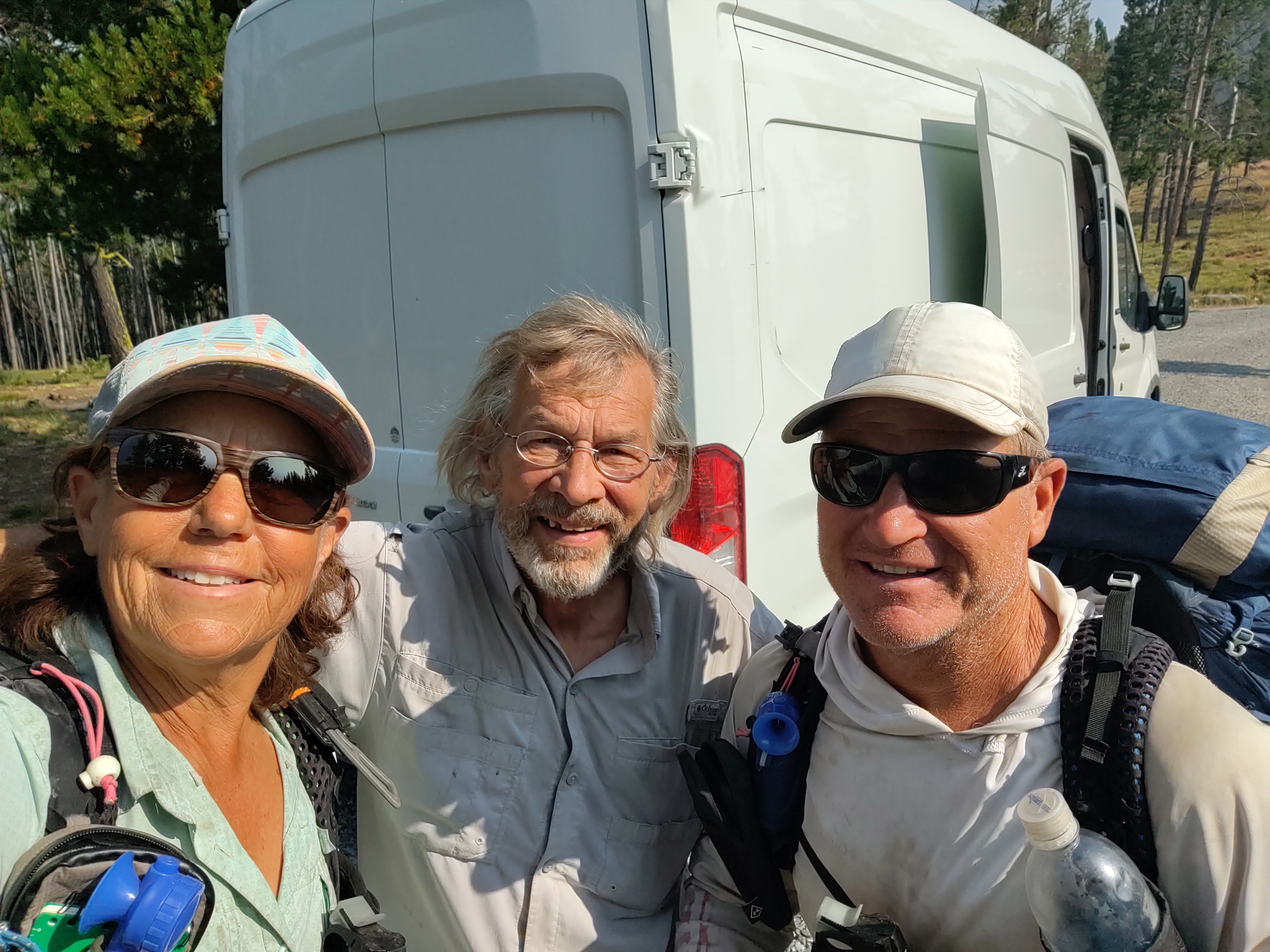 Our mornings intent was to get to Flesher Pass (6miles), and hopefully “yogi” some water, if anyone was parked there. No such luck at the Pass, but when walked into the Forest Service campground to use it’s restroom and take a break for breakfast, we were greeted with TOTAL TRAIL MAGIC! Turns out that “Golden”, was parked there with his van, waiting out the heat, before he got back on trail to finish the CDT, and his Triple Crown.