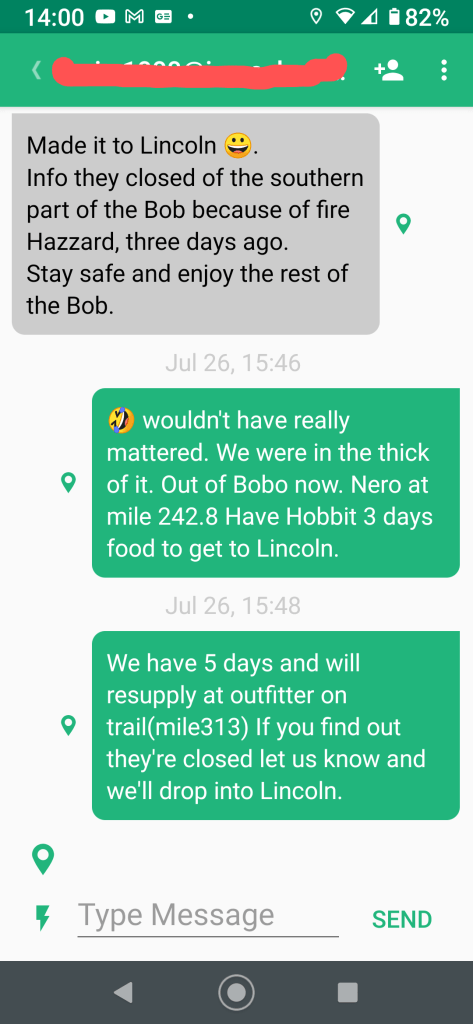 While at Dave’s, who’s located by Stemple Pass (mile 302.5/SOBO), we were treated to a drink (soda or Gatorade) on the house, and a store so well stocked, that it could rival any REI, save for the floor space. Here we bought our resupply that would get us to Helena Montana, and a much needed zero. I also was able to buy a new Osprey Exos58 pack to replace my “fractured” one. Dave even mailed said tired pack back to my home so that when I get back I can “cash in” on Osprey’s magnificent Lifetime guarantee. I didn’t have a week or more to wait to change out said pack through Osprey.