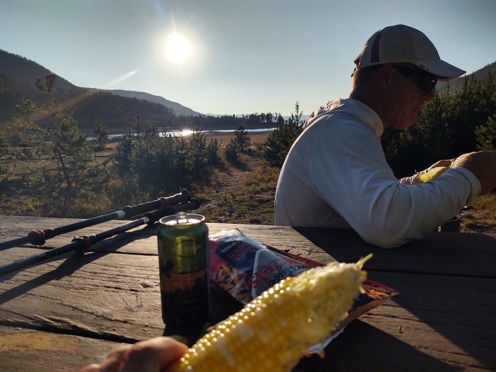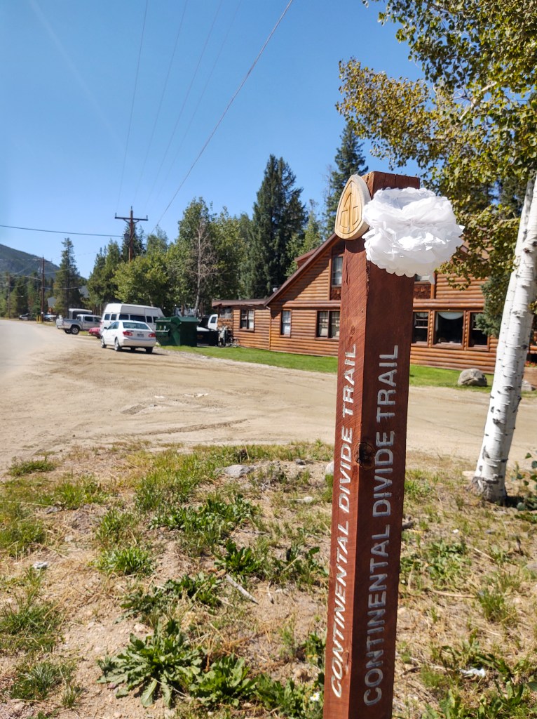 They dropped us at the post office, per our request. Only problem, it was closed. Figures. The thing about Grand Lake is that the CDT runs the length of the town’s main street. Onward we trekked through town, whose wooden boardwalk “sidewalks” have the CDT emblem embossed on boards periodically. Shops lined the boardwalk with stuff we couldn’t buy, nor carry. We were now in search of adult beverages. We asked a couple who smiled and nodded at us, if they knew a place we could get a cold beer. “End of town. It’s happy hour. Two for one prices”, they responded. Perfect!