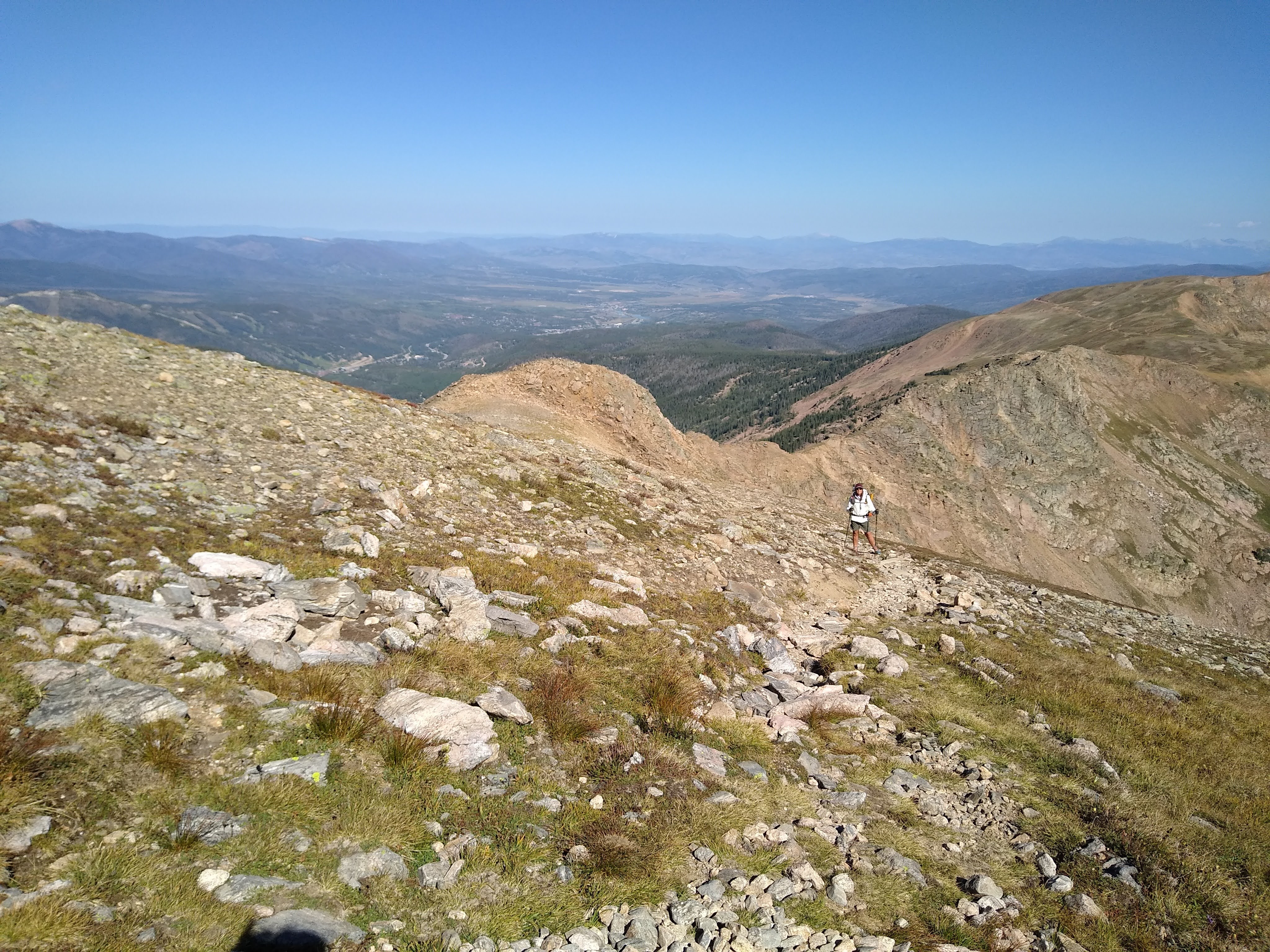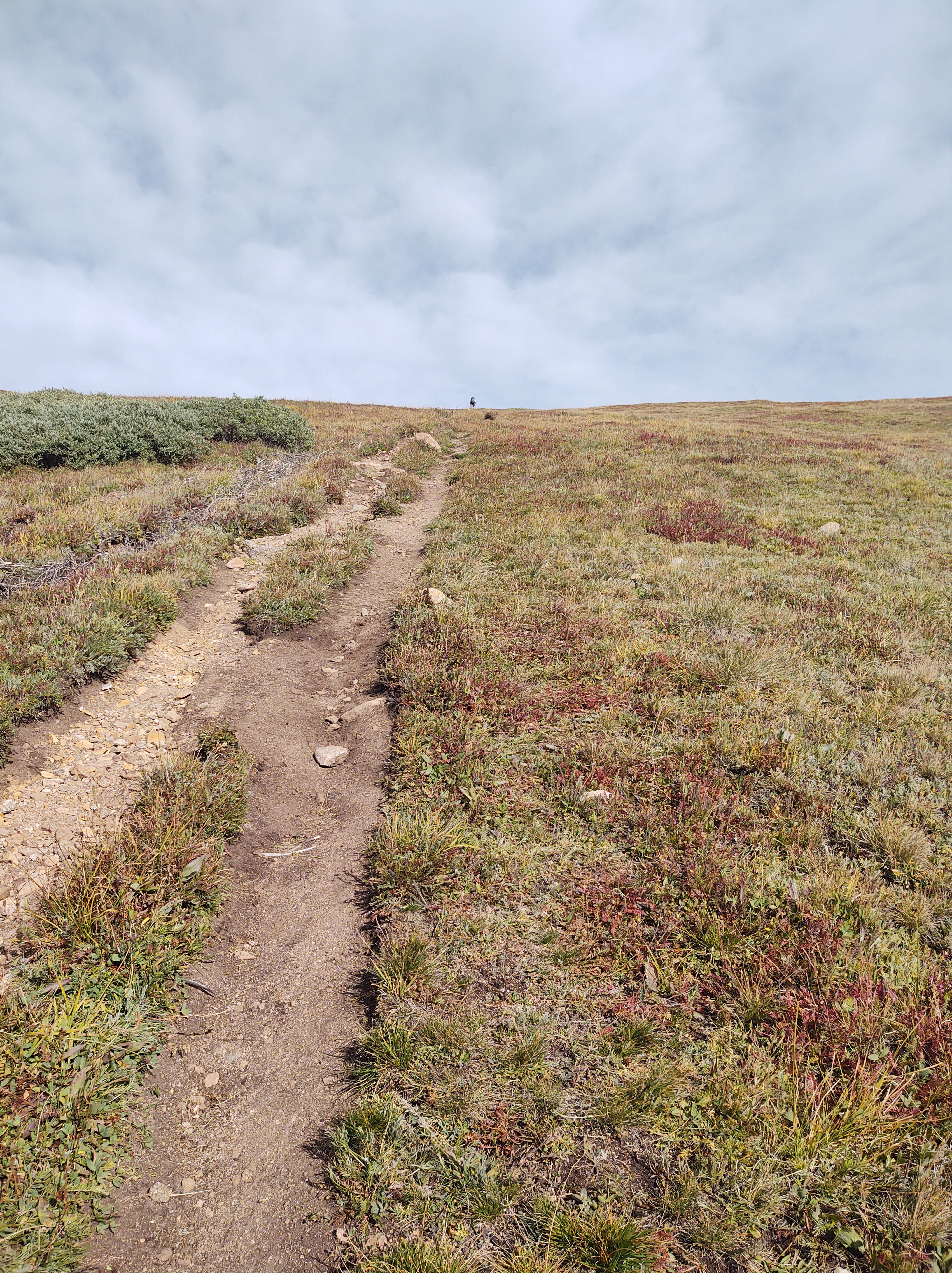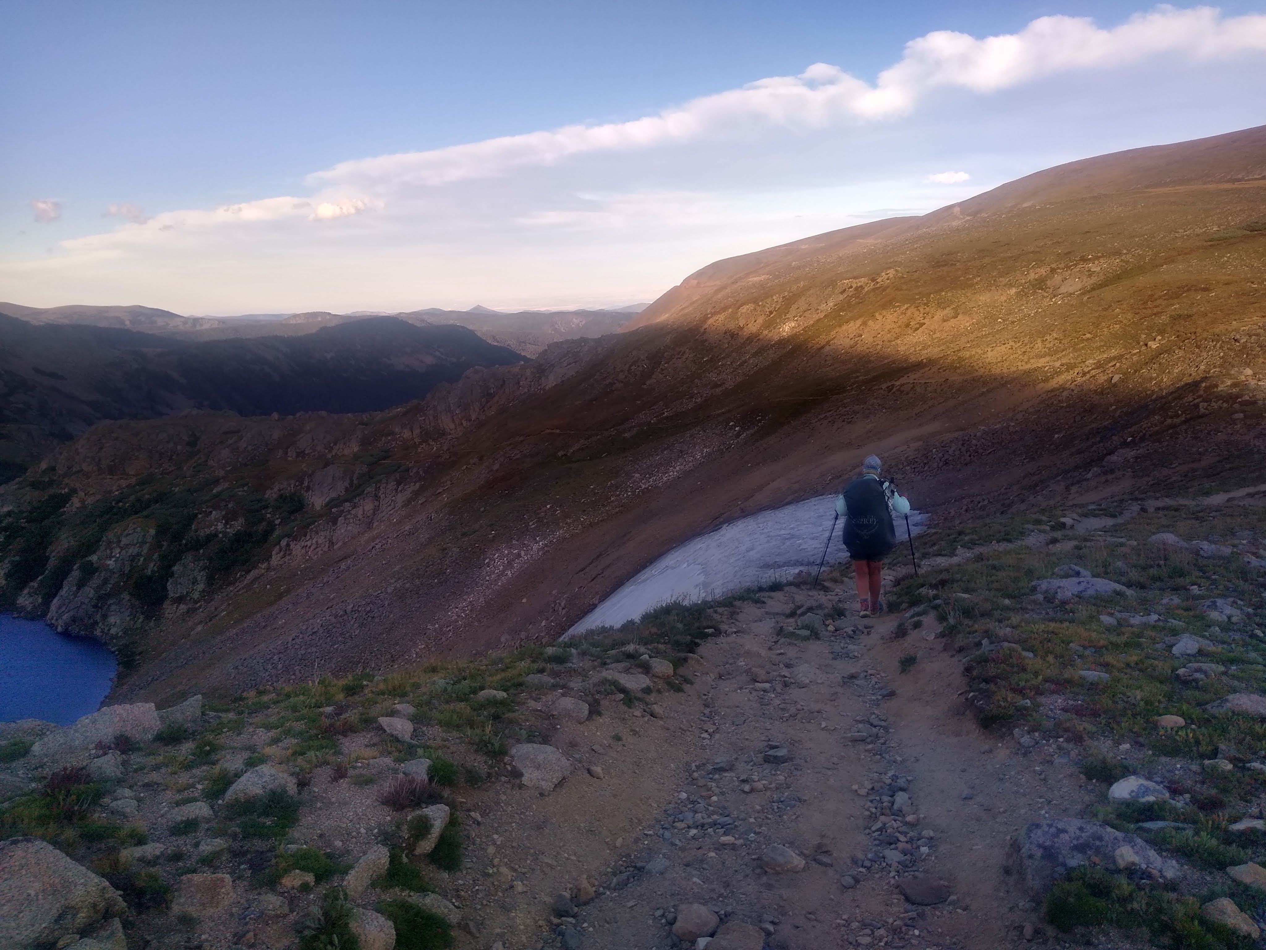 The tread was made up of fairly stable scree and interlocked rocks. As it was a Friday, we were not alone by the time we made it to the top. Our descent took us to a parking lot at Berthoud Pass. The parking lot was nearly full. Our timing was such that we met up with Sprouts, who had just gotten dropped off at the pass…rested and adequately fed. She was going to keep on trekking.