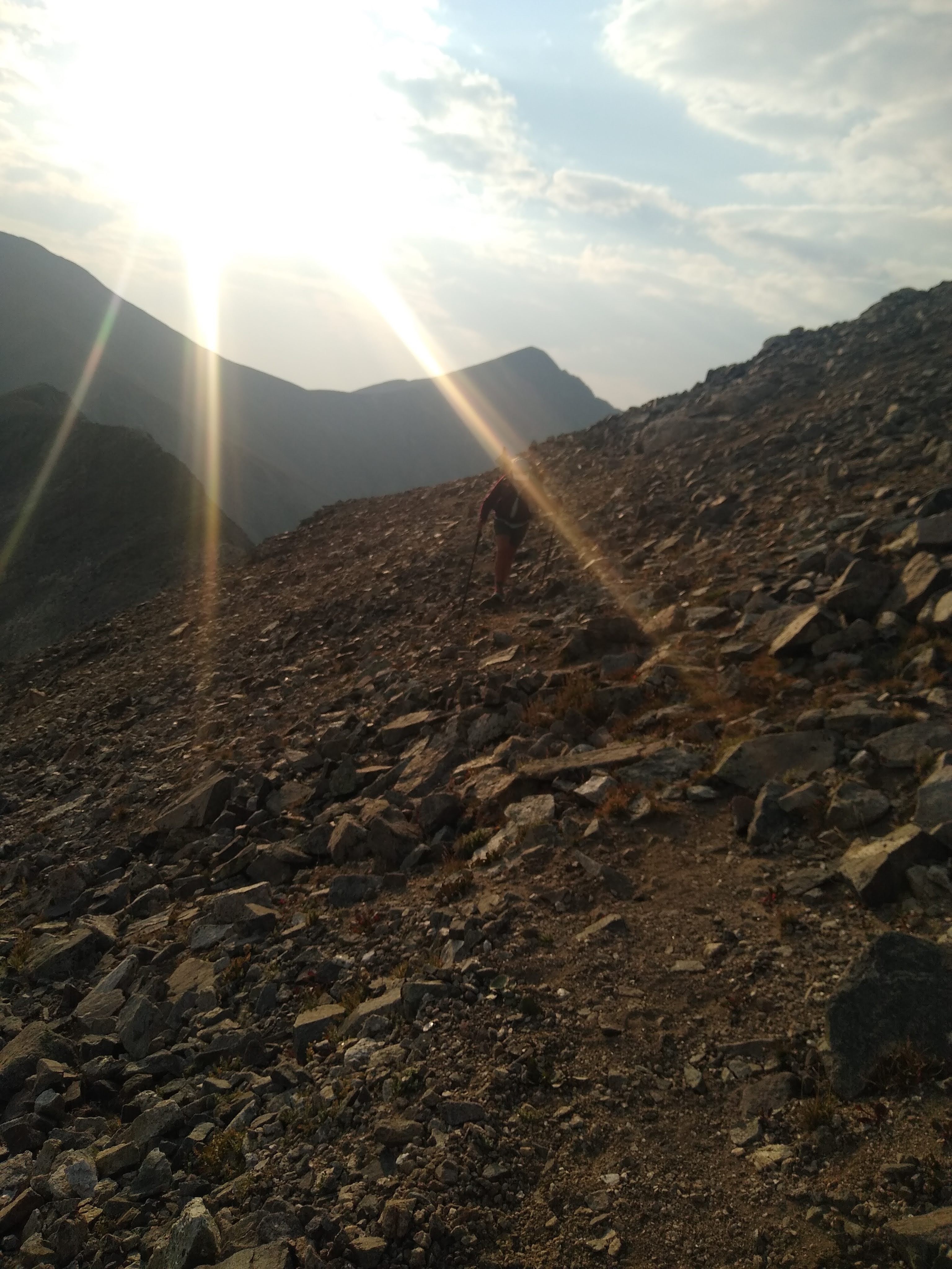 Since we arrived at the base of Gray’s at 1 pm, we decided that since it was only 3,000 ft climb over 3.6 miles to summit, we decided we had plenty of time.  By 4 pm, after stopping and talking with numerous people, who wondered what the hell we were doing (climbing in the afternoon, and carrying more than a day pack) we reached Gray’s Peak (14278 ft.) by 4pm.
