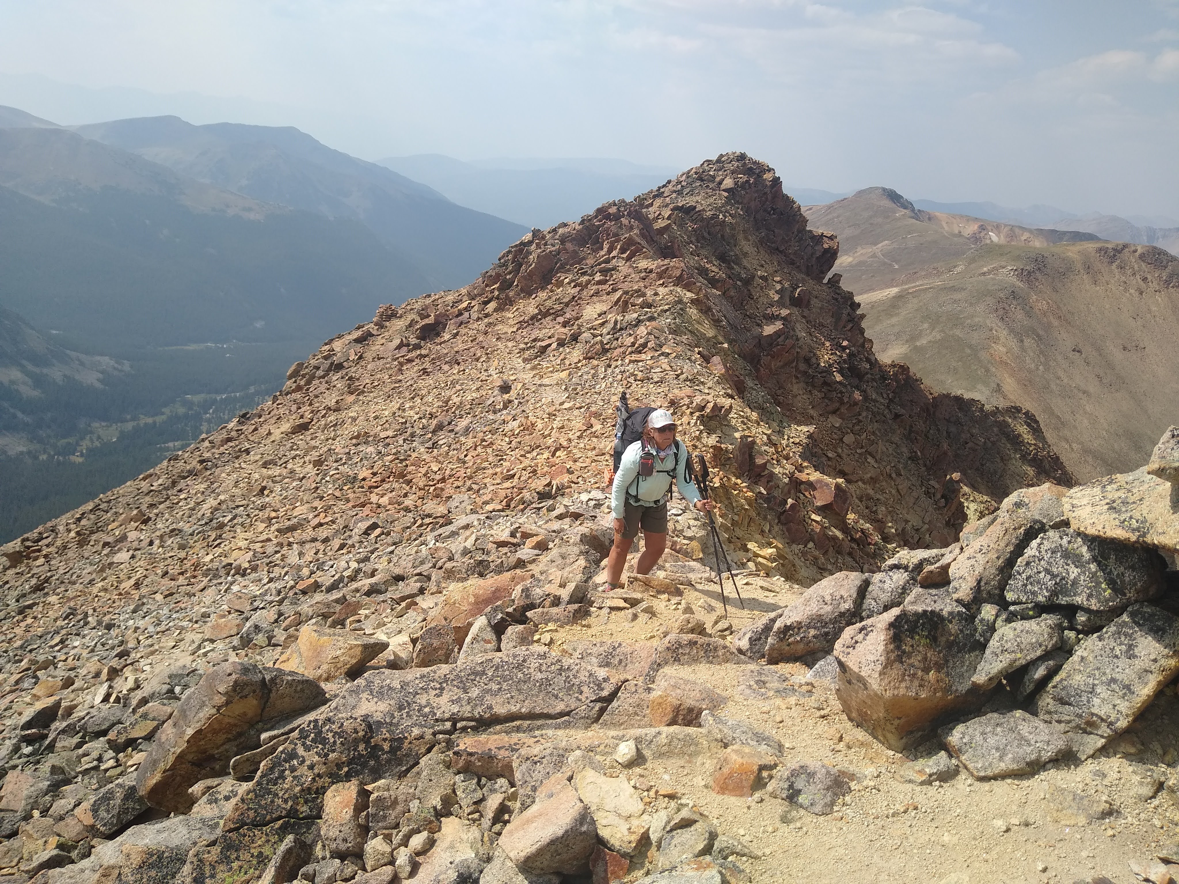 In order to get to the ridgeline we were to walk at 13,000 ft. for most of the day, we had to climb the “remains” of a miner’s “ladder/stairs” to get to a faint trail, and then carefully traversed the hillside made of scree (loose rocks) and spotty vegetation. When we made it to the start of the Ridgeline walk, we took a well deserved break and surveyed what lay behind us.