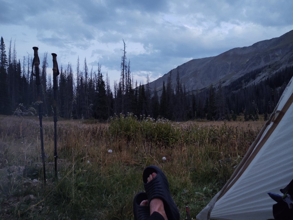 While we made the climb to Hope Pass (12,532 ft) in just over an hour,(compared to the 3 hours it took to make a similar elevation gain summiting Gray’s Peak) we almost bit off more than we could chew. We did however, make it to our intended campsite with enough light to set up our tent…but not to eat. That required our headlamps.