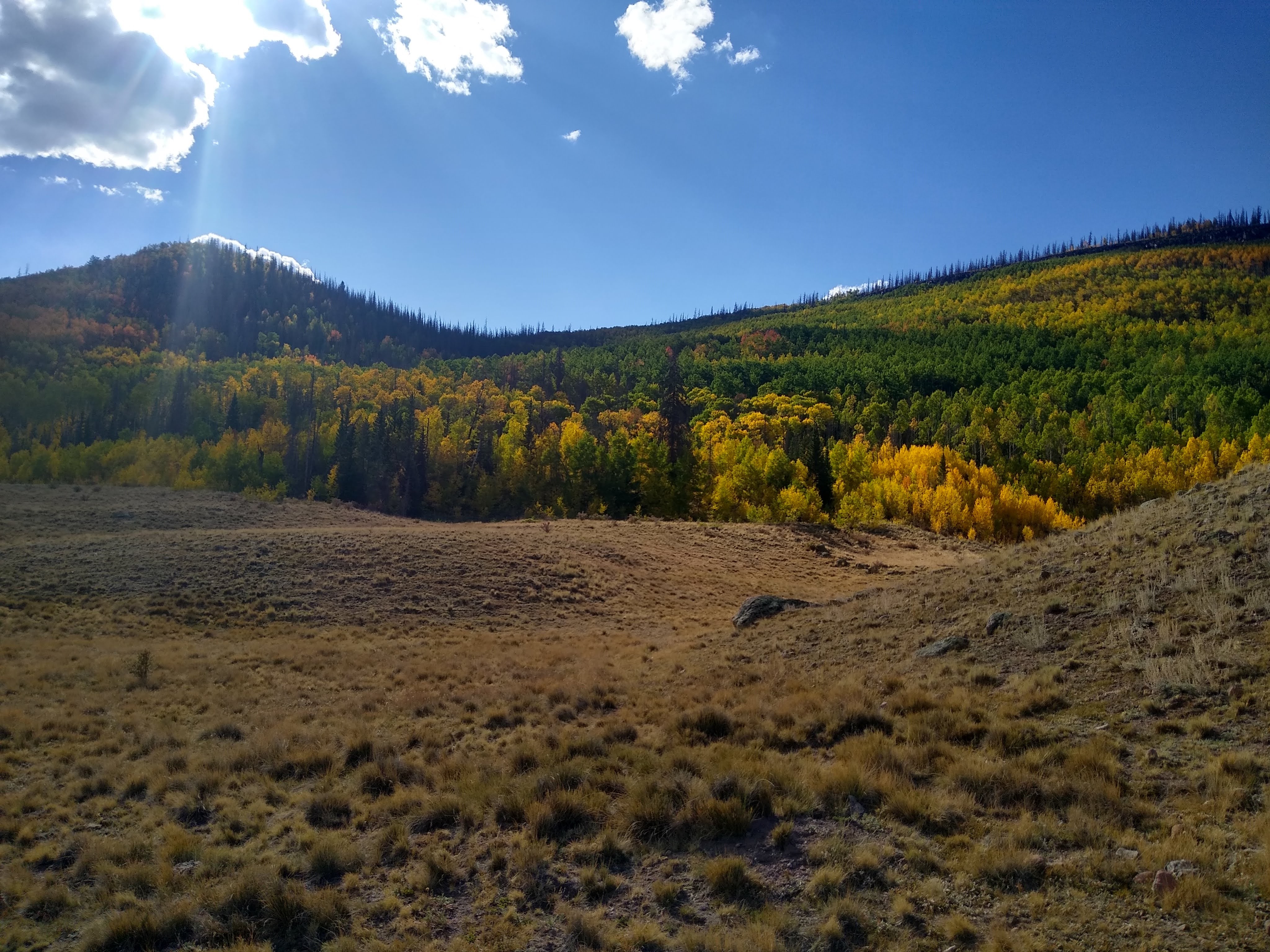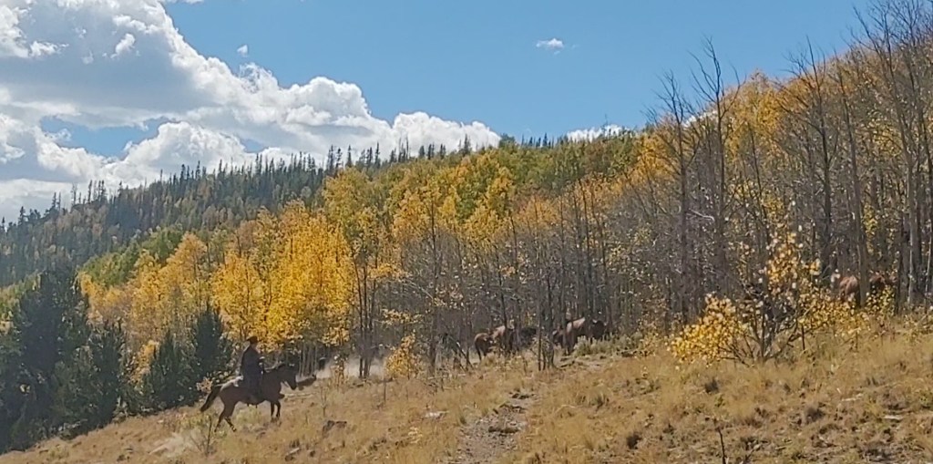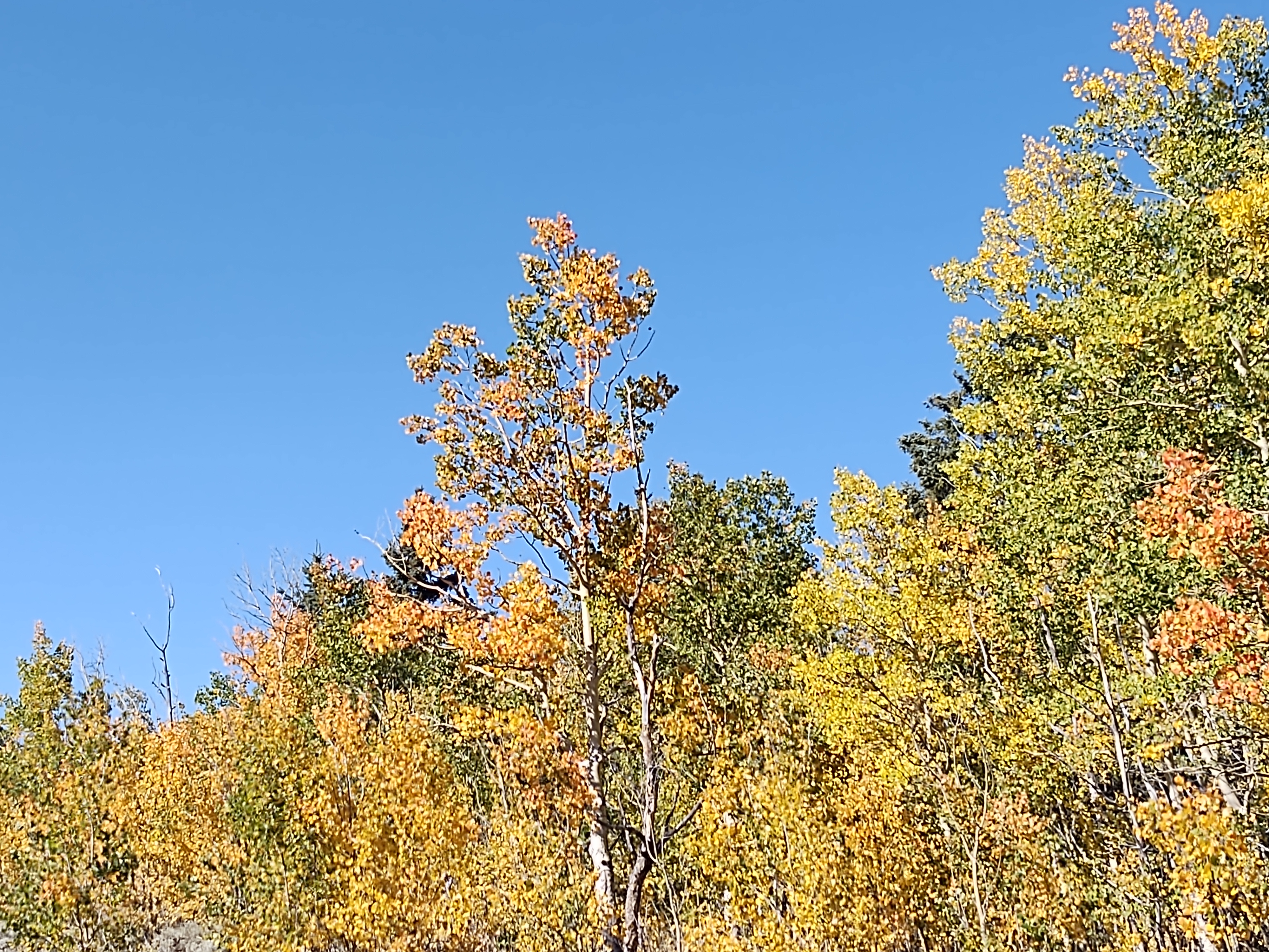 Today was a colorful treat. The Aspens mixed in with the mountainside’s pine forests were now changing color. Golden yellow was the norm with patches of deep red and orange begining to show. One Aspen sported a range of color that reminded us of a “Big Stick” popsicle.