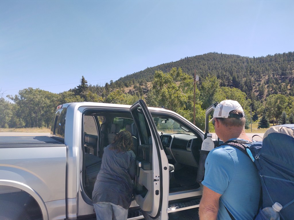 As Paul dug out our “CDT hikers to Trail” sign, we wondered how long this hitch was going to take. Paul looked at his watch. “12:26”, he said. Less than 30 seconds later, a truck pulled up and asked us if we wanted a ride. He hadn’t even fully unfurled the sign.
