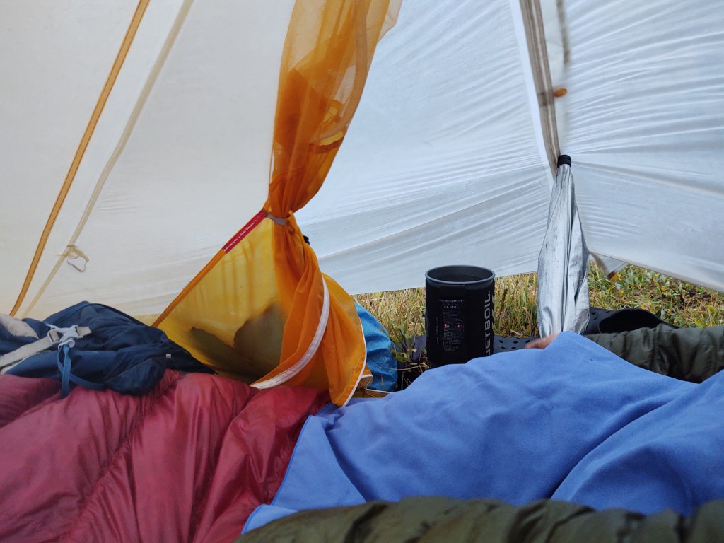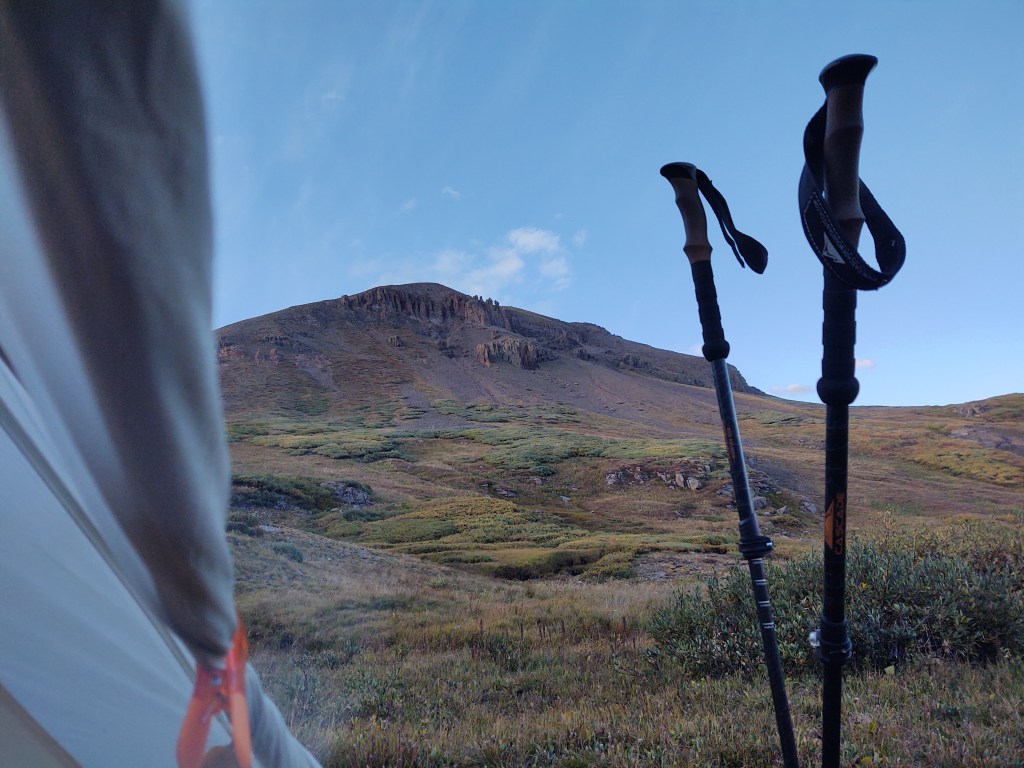 I awoke around 2am with what I thought was a headlamp beaming into our tent. Nope. The clouds had cleared and the moon was shining upon like a searchlight. I guess that’s good? There was hope for a dry morning. No sooner did I settle back to sleep, the clouds returned and delivered another dose of rain.