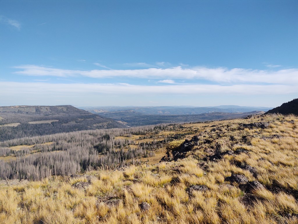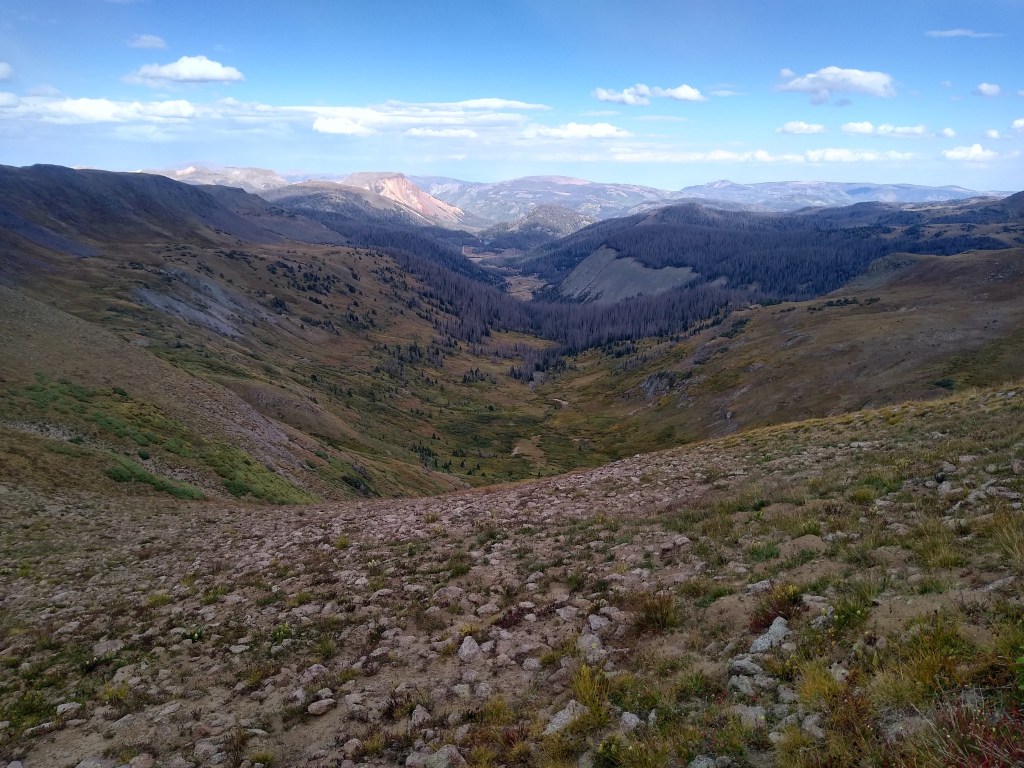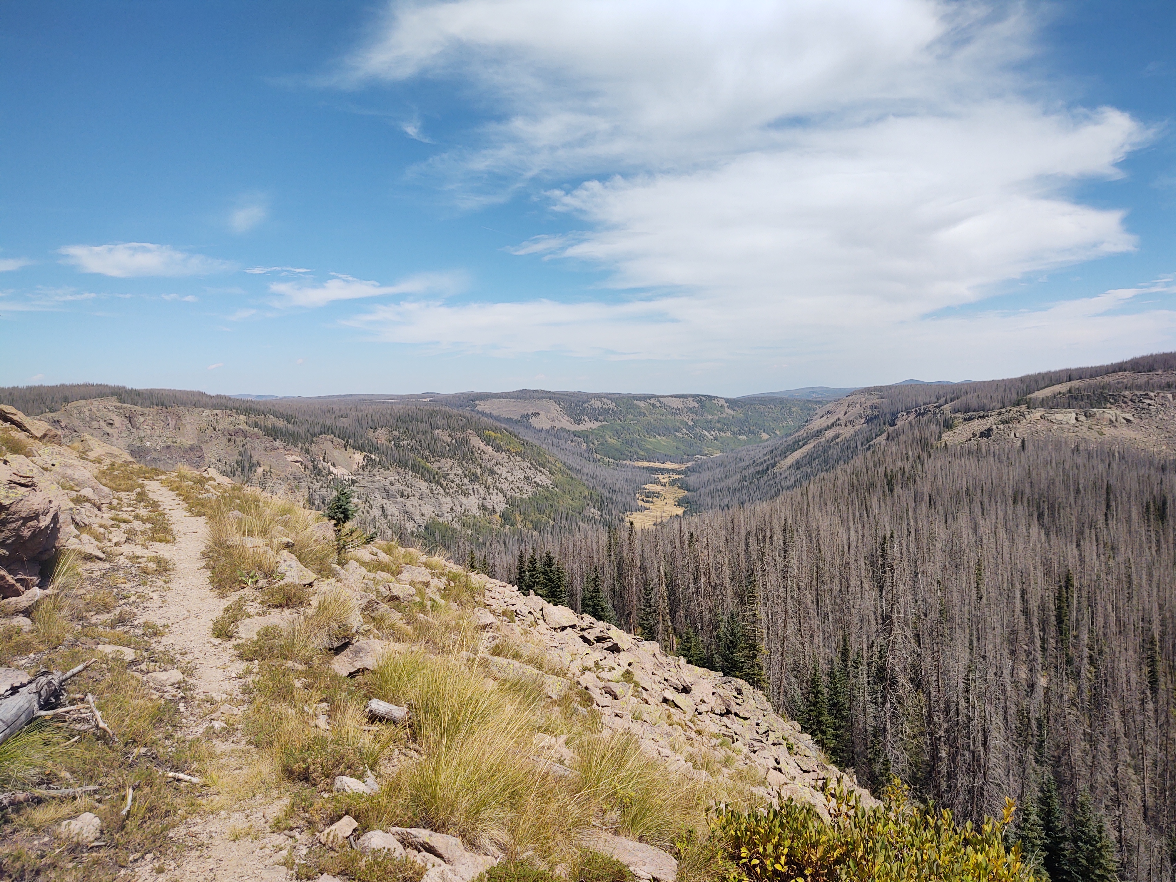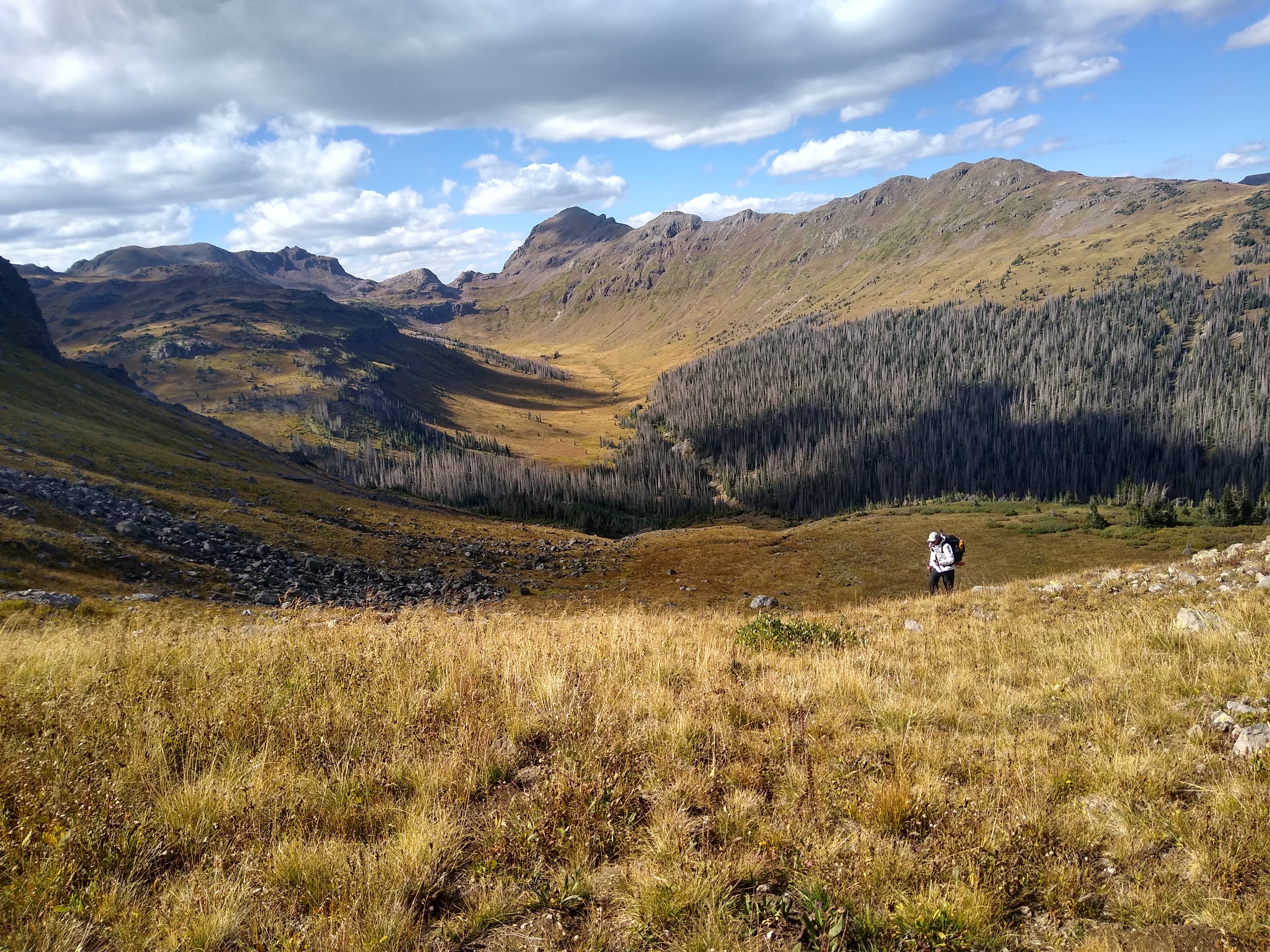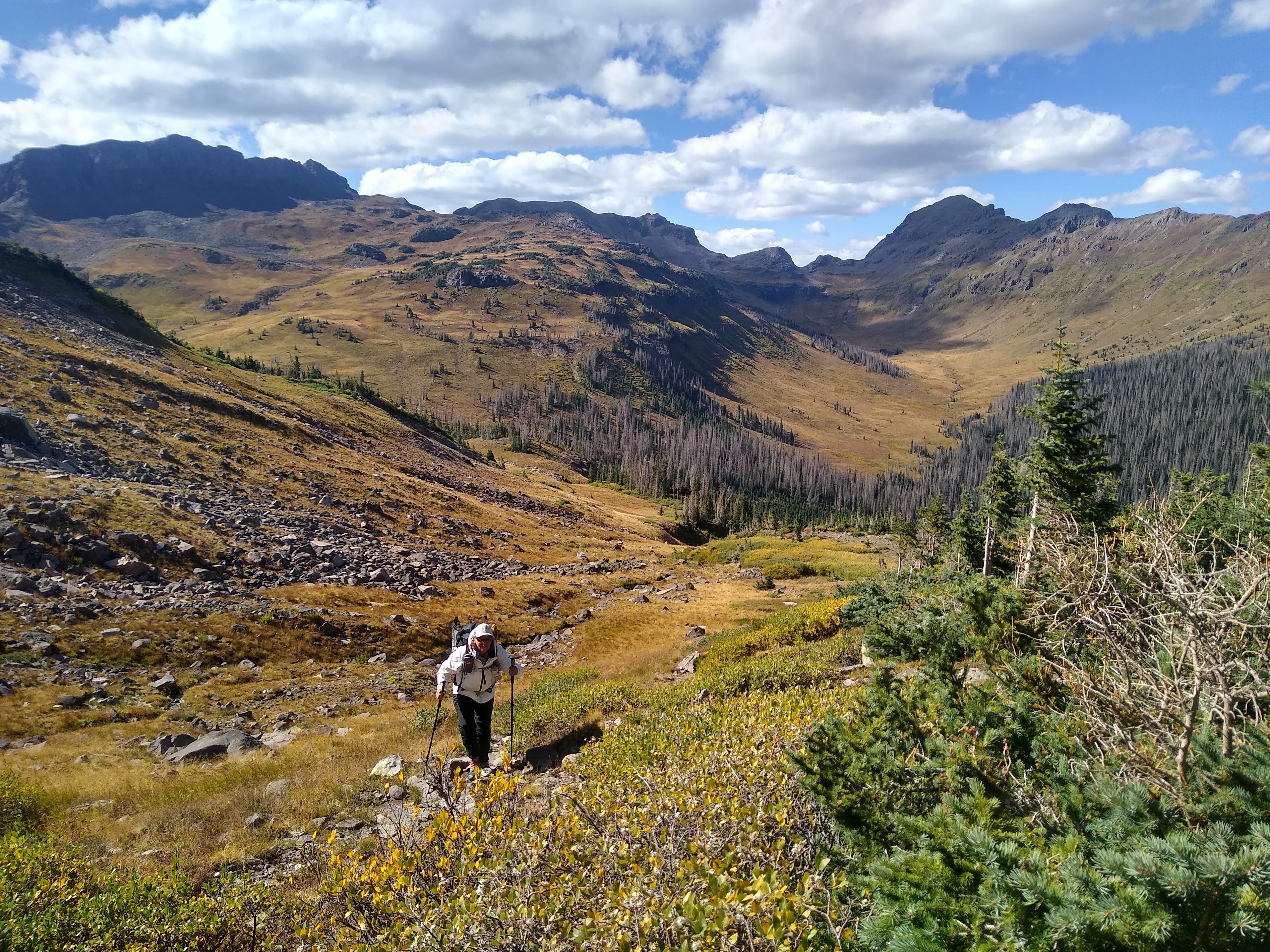 By the time we reached the “Rock Bivy” and the borderline of the South San Juan Wilderness, the wind returned, but the edge of the mesa revealed yet another rich and colorful roadless valley below.
