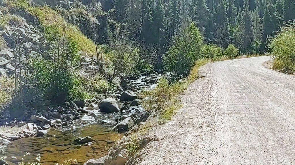 Once shopping was done, we lunched at the Pizza joint next door. Our intent upon ordering the XL pizza, was to take half of it with us for snack/dinner. Before we knew it, we ate the ENTIRE pizza. We even considered squirreling away 4 perfectly good slices of pizza left on the table next to us, by patrons who had left it for the busboy to clear. “Hiker Hunger” is that strong! With our manners and personal integrity successfully over-riding our very real and sustained “Hiker Hunger” , we collected our packs and walked to the edge of the busy Hwy 160. It too was too dangerous for us to feel comfortable walking it, as well. From here we would try for a hitch to Park Creek Rd (a dirt road), and then walk the remainder of the “blue line”/Elwood Pass Alt.