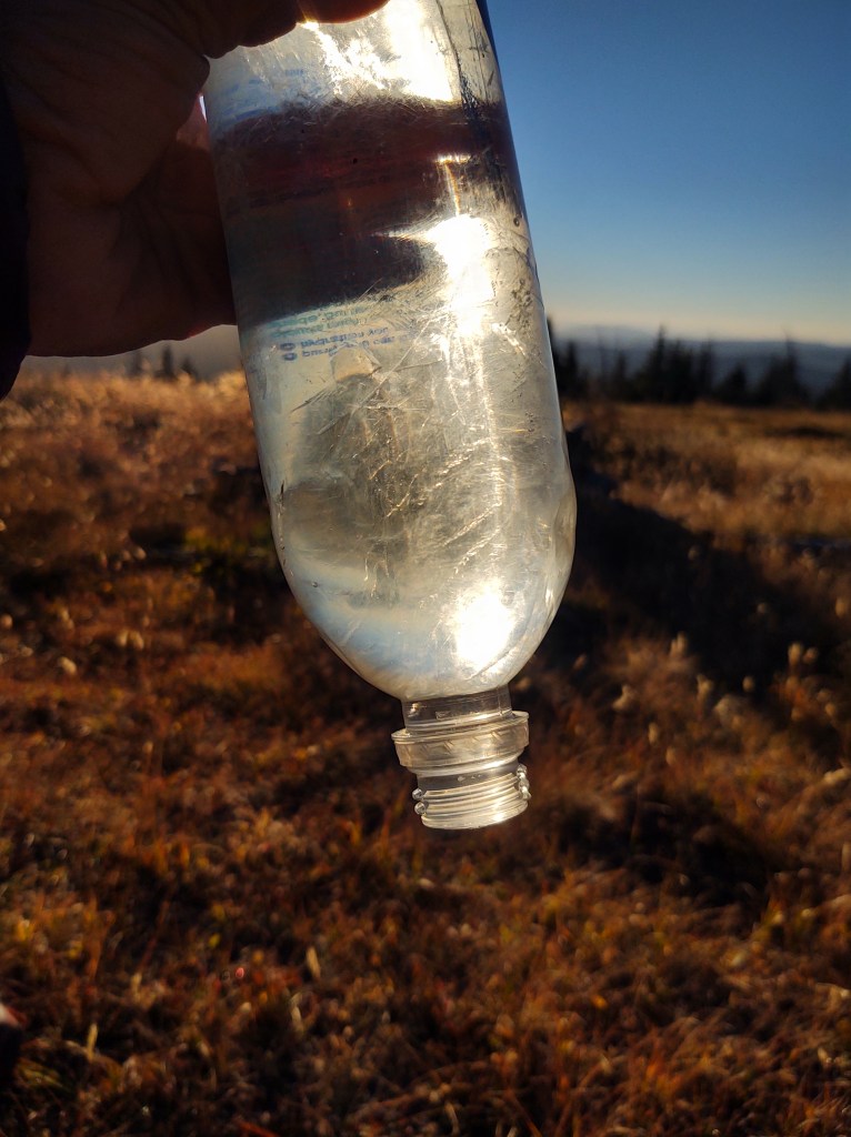 Our water bottles were frozen, and so was our fuel. No sense getting up now. This cold required coffee to walk, and with under 10 miles till town, we could wait. After “melting” enough water for coffee, we were on our way. As we descended, we could see a lake, in the near distance. It’s edges appeared to be frozen. The cold was here to stay. Our timing was impeccable.