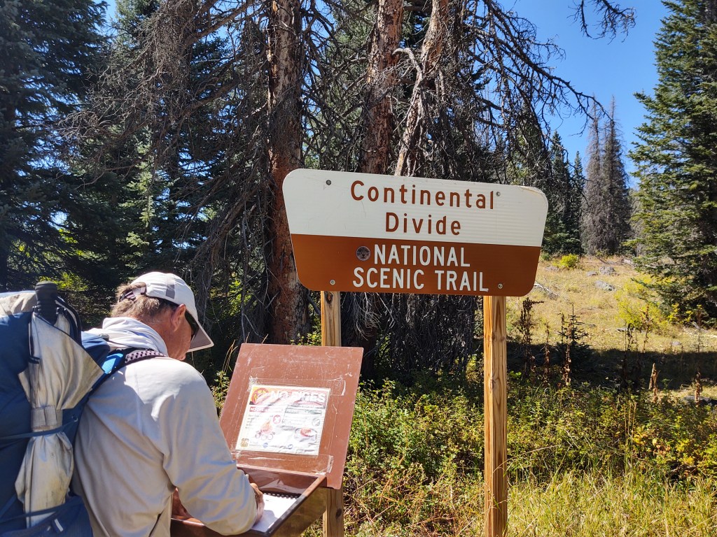After a comfortably “warm” night’s sleep, and a chilly, but not frigid morning, we hoofed it the rest of the way toward Elwood Pass (11,644 ft). We expected the road to be like a freeway, with elk hunters scurrying to their hunting spots at the wee hours of the morning. Surprisingly, there was virtually NO traffic till later in the morning. And, even then it was fairly sparse. When we got to the pass, a couple was unknowingly seated at the CDT trailhead. They had stopped their ATV for lunch.