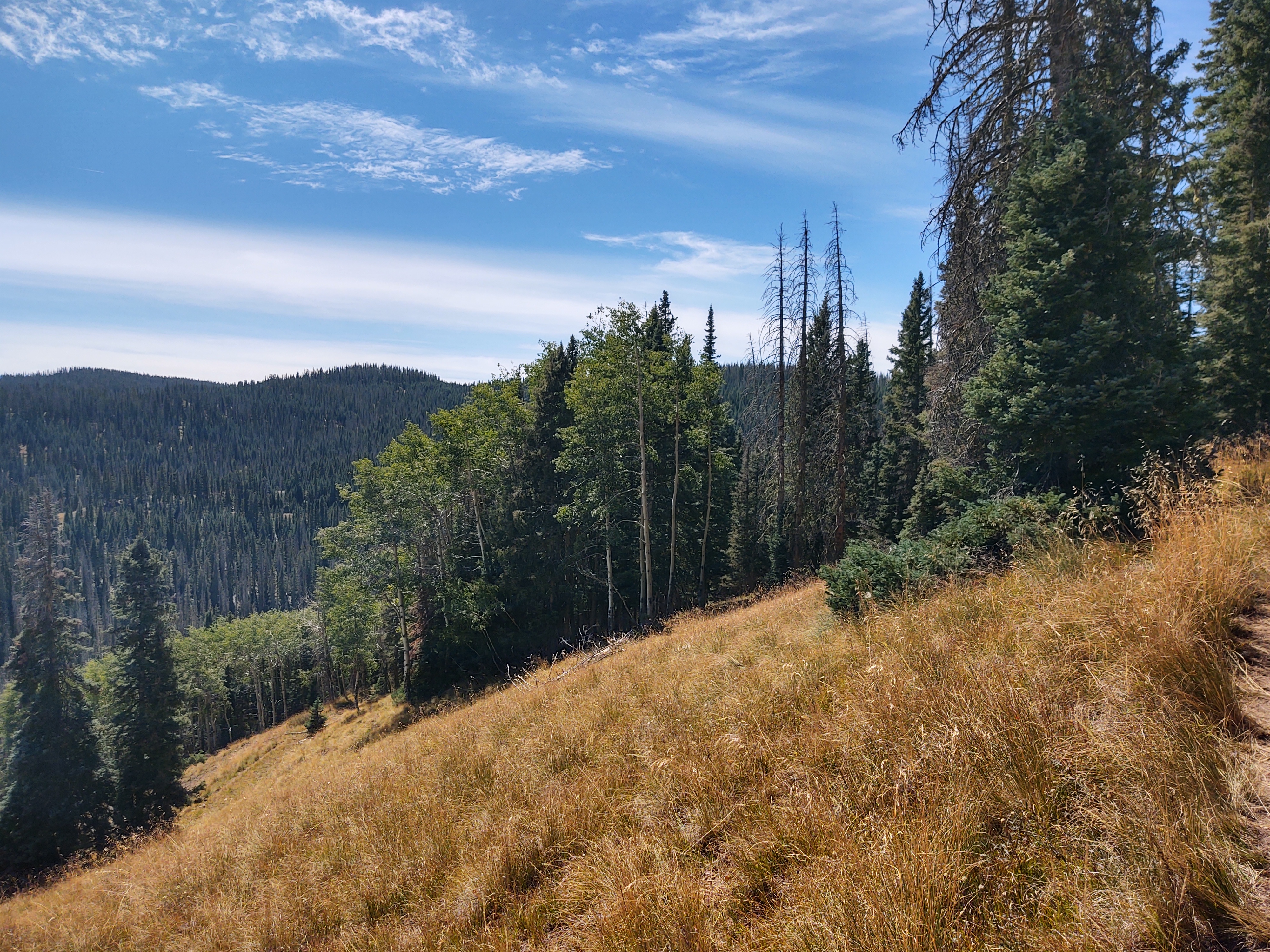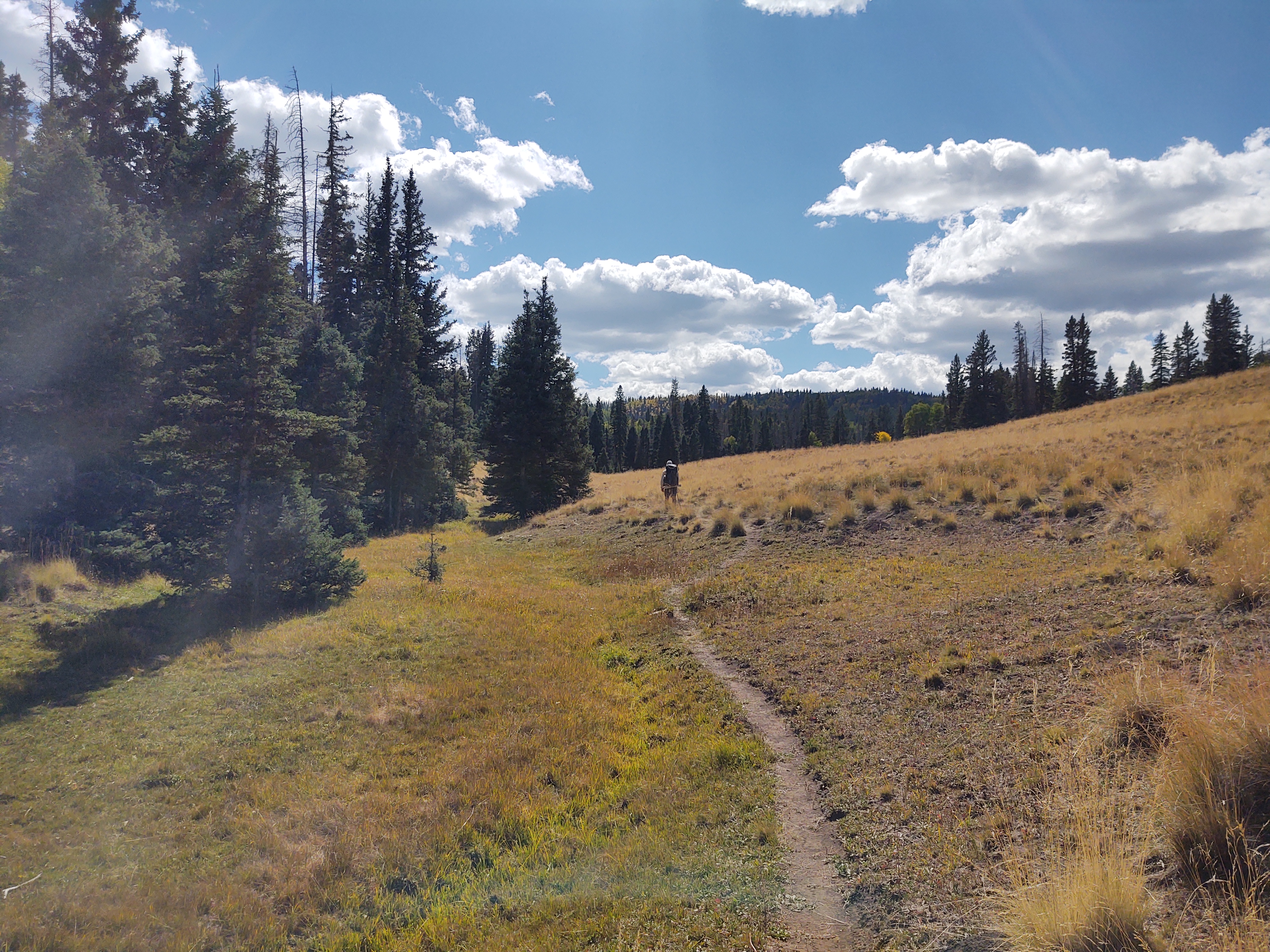 As we pattered on, we jumped a small herd of deer, and both startled and were startled by… several grouse. Paul spied a cow elk, or so he claims, while I on the other hand neither saw nor heard said elk. An avenue of golden giants left us in awe and flanked us on either side of the trail, as weaved our way through the tallest and fattest grove of Apsens we have ever seen. And, as we have come to be reconciled with this trail, our last 2 miles were comically “uphill”, and littered with rocks that required our utmost attention. We set up camp on a knoll, hoping to catch wildlife sauntering by.