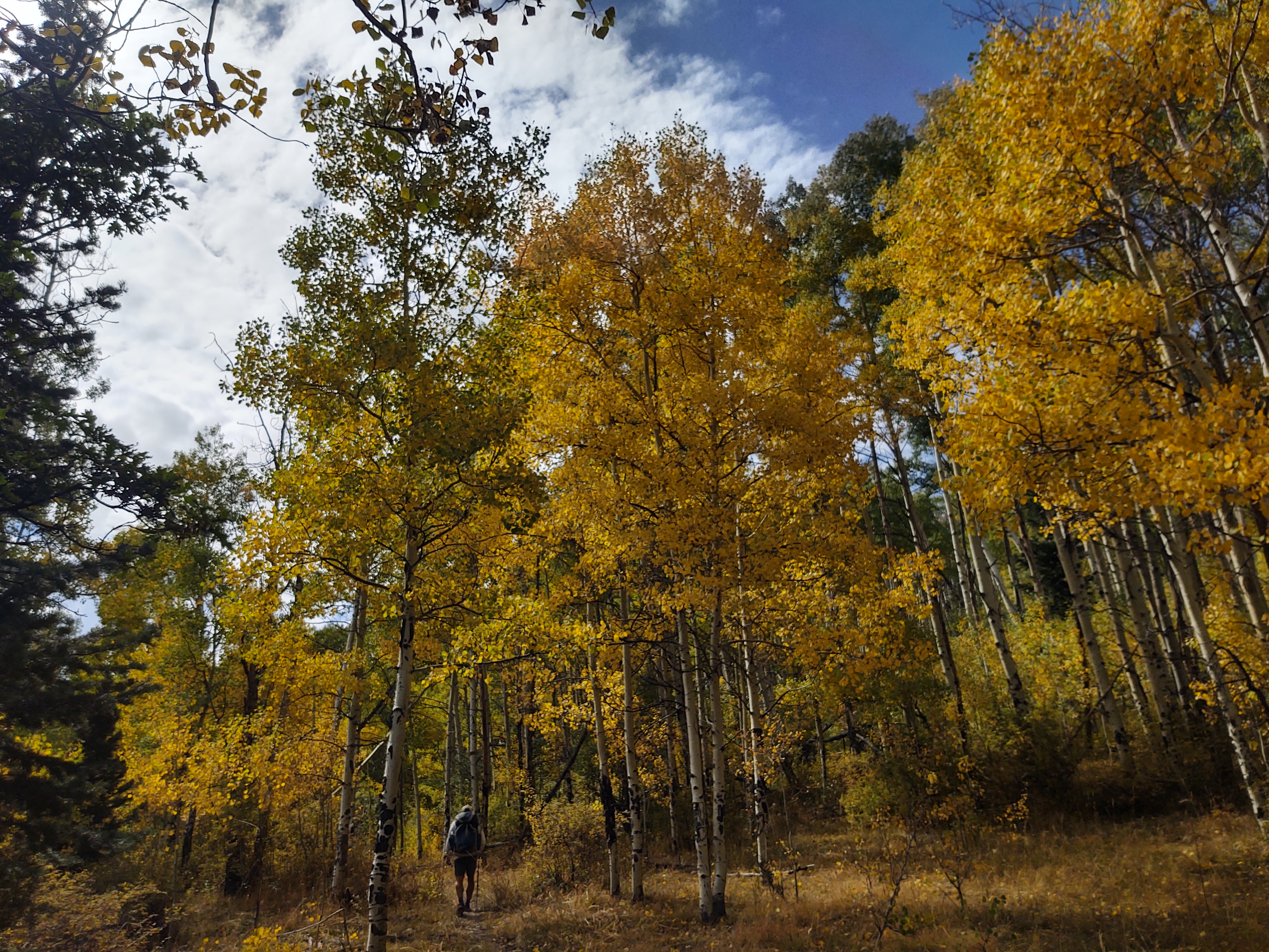 Again, the elk were quite robust in their banter till the wee hours of the morning. A giant bull elk stomped by our tent near midnight, but passed before we could clamor out of the tent to get a full view.  The morning found us following well used and often faint forest roads through golden fields, clusters of deep green pine and groves of turning aspens whose leaves of bright yellow littered the ground.