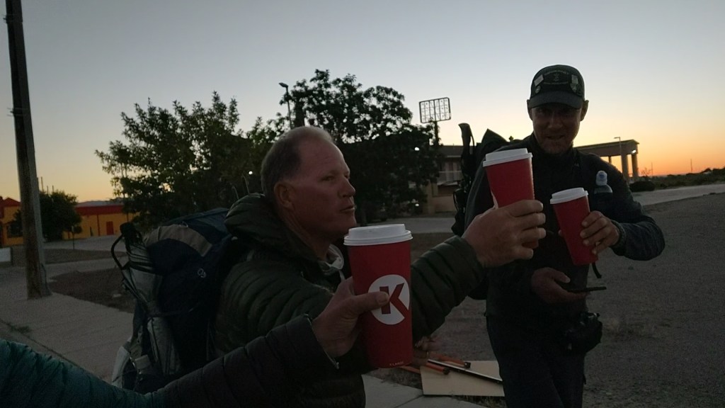 As we sat inside our tent, finishing our coffee, we could see the piercing glow of headlights approaching. It could only mean one thing. SOBOs on the march! The first pair dropped down into the wash and made the left down the sandy lane, quickly disappearing out of sight. Another one, not more than 5 minutes later, appeared and stepped into the wash. “You’re too late for coffee, should have been here earlier”, Paul yelled out to the bearded hiker (who happened to be Darwin, of Darwin on the Trail). The hiker somewhat bewildered, chuckled at the voice that came from the darkness, and continued on. Now almost fully packed up, yet another SOBO hikers dropped into the wash and made their way down the soft and sandy trail. We wouldn’t see any trace of these four until the next day.