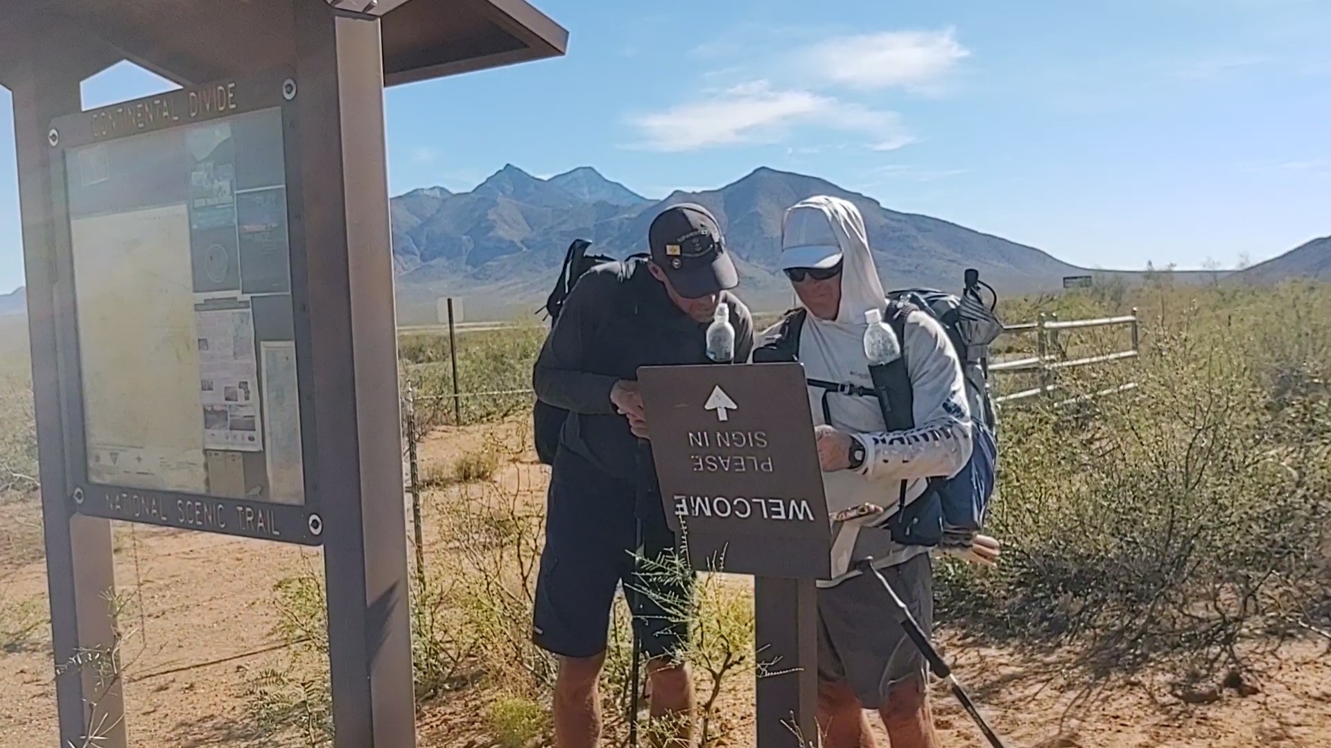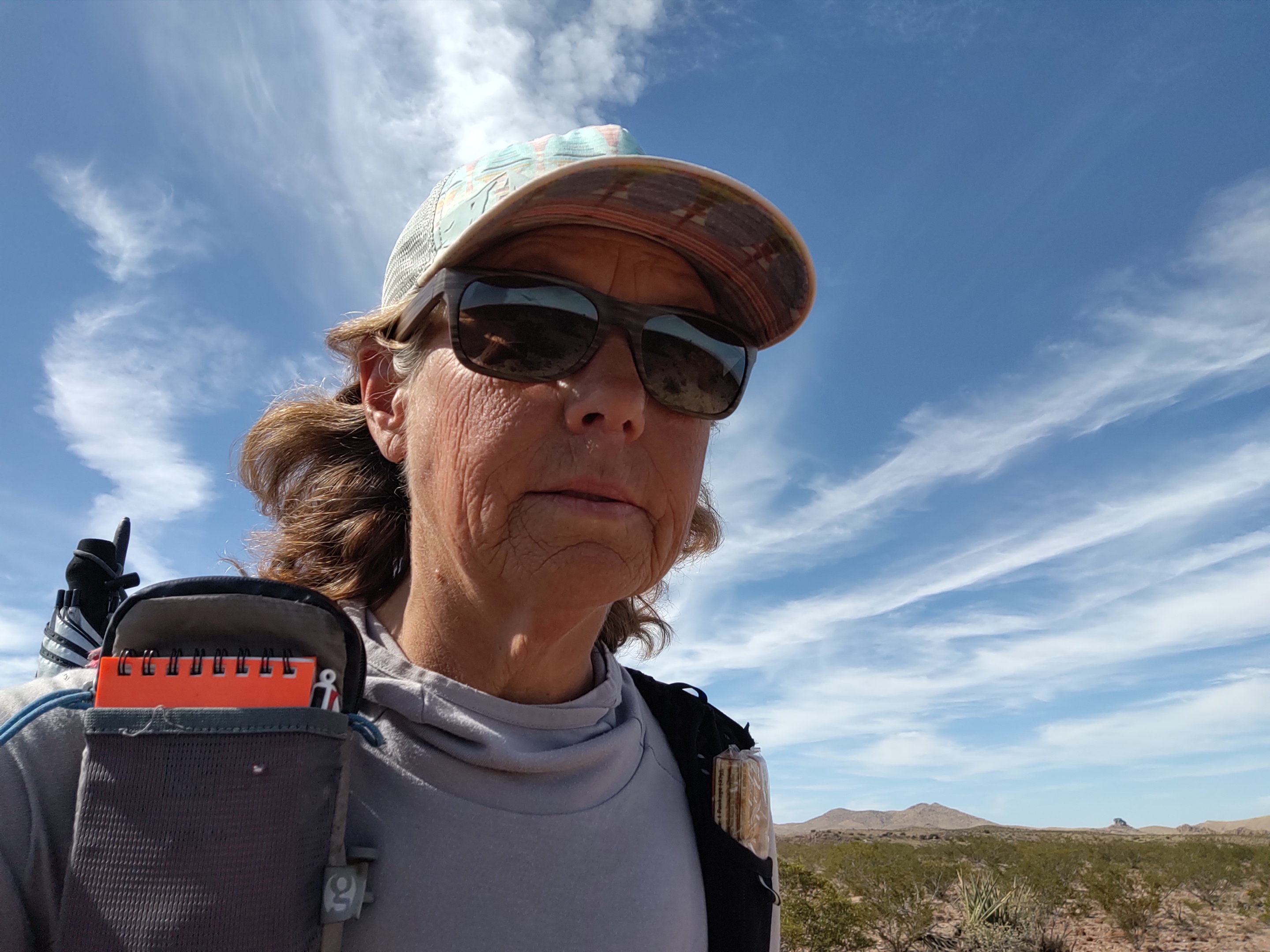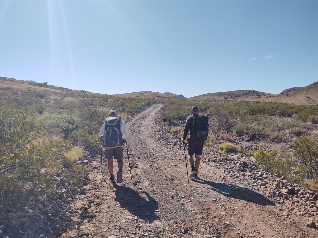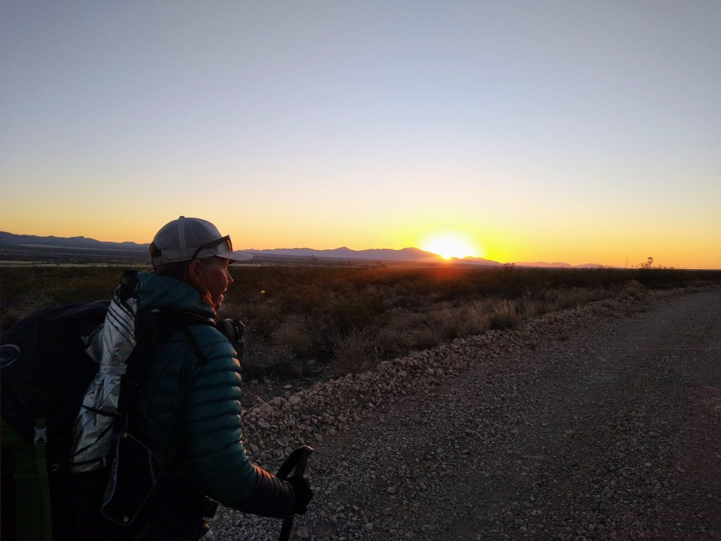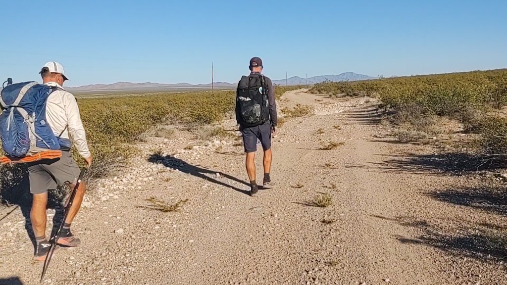 While I would have preferred to walk the rest of the “redline” to the monument, the thought of “needlessly” climbing a mountain to get on the other side to only walk parallel to the road we were on, seemed silly. Thus, dirt road walk it was. Just prior to reaching the solar windmill, Ray passed us again with his “cargo”. We knew, and had met three of the four passengers (Darwin, Bopit and Punisher). They looked worked and relieved to be done. Bebop and Punisher had earlier told us that they had planned on hiking an entire calendar year, so I asked them if they were headed to the Arizona Trail (AZT), like they had planned. “Hell No!”, was their reply. “We’re headed home. We’ve had enough. This trail was brutal”. Not gonna lie, but for them to declare this trail brutal, and for us to have completed said trail as well, made us feel pretty good…for old farts.