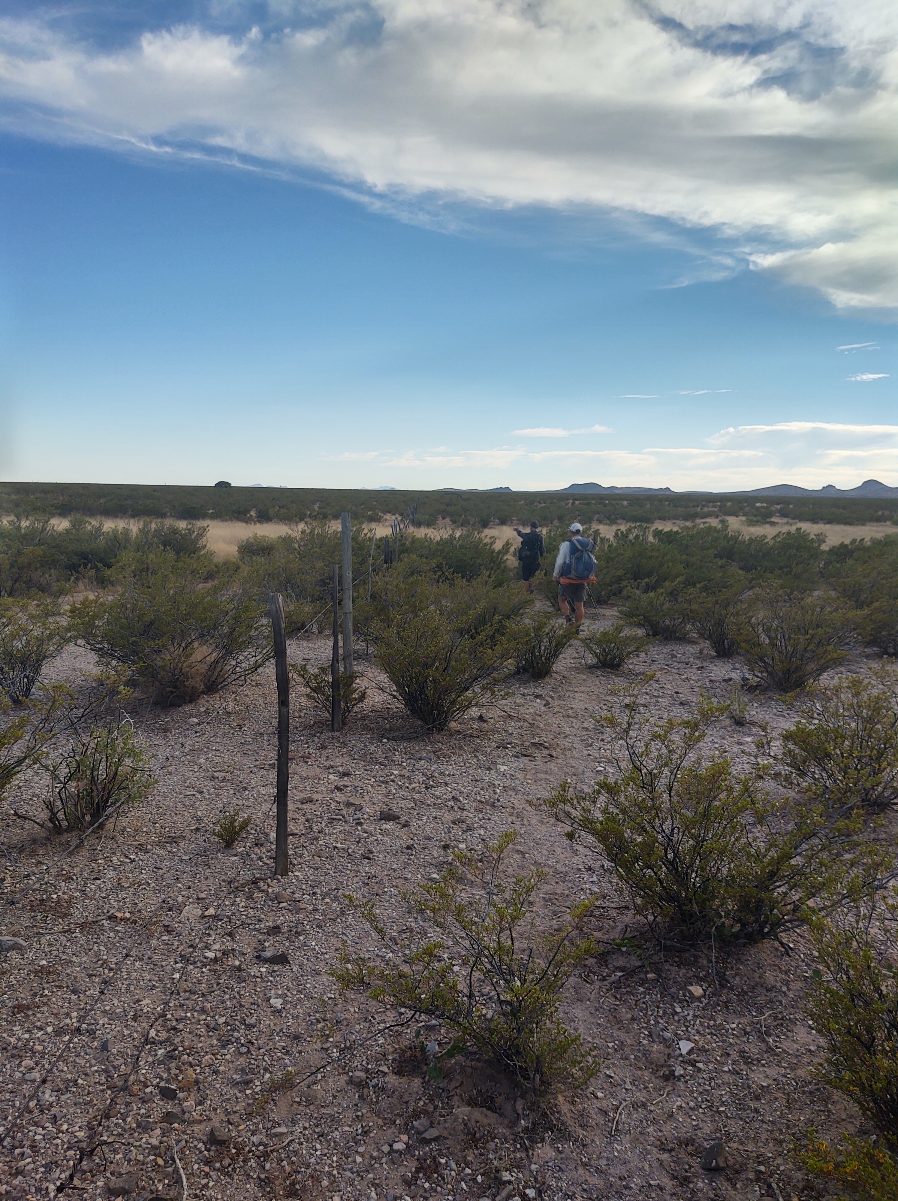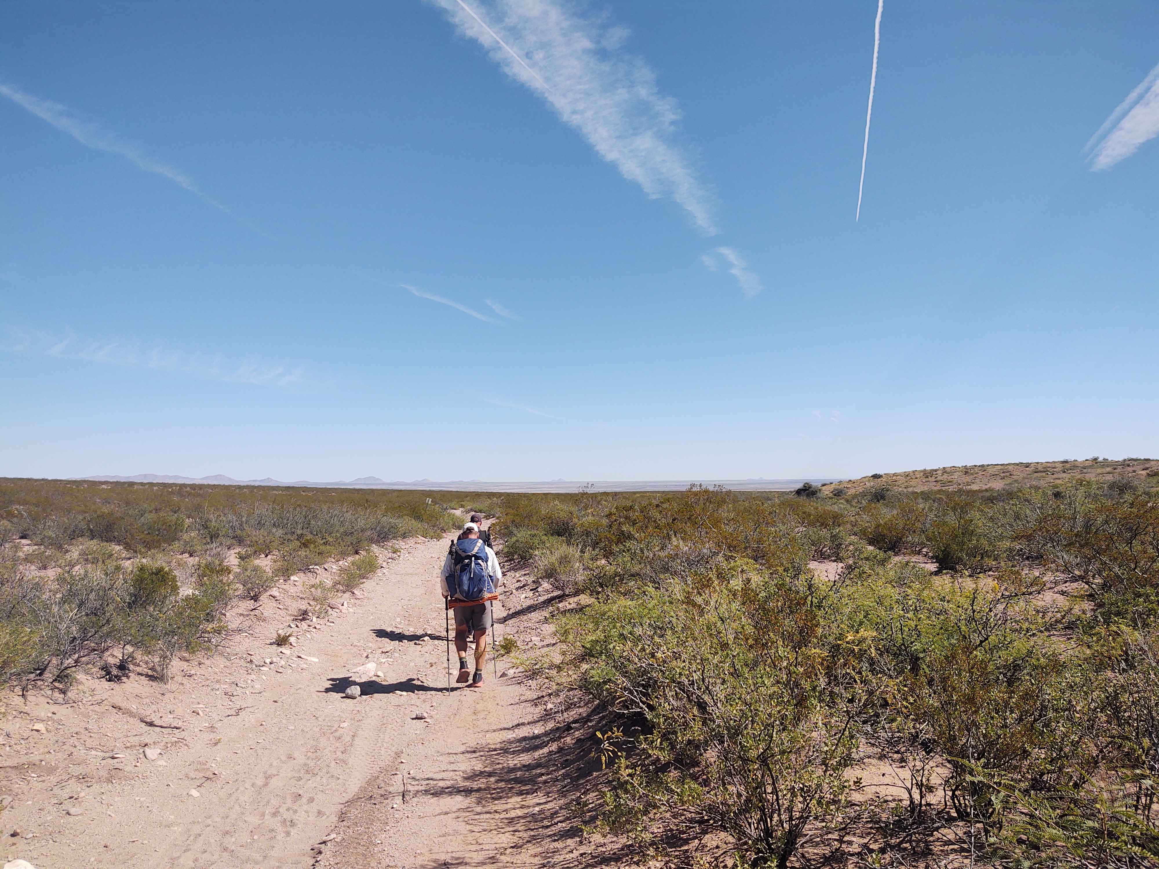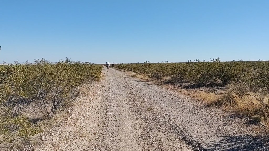 The trail continued along a dry and dusty dirt road. In the distance, little mountain peaks pop up, accentuating how desolate and flat the terrain we are currently walking is.
