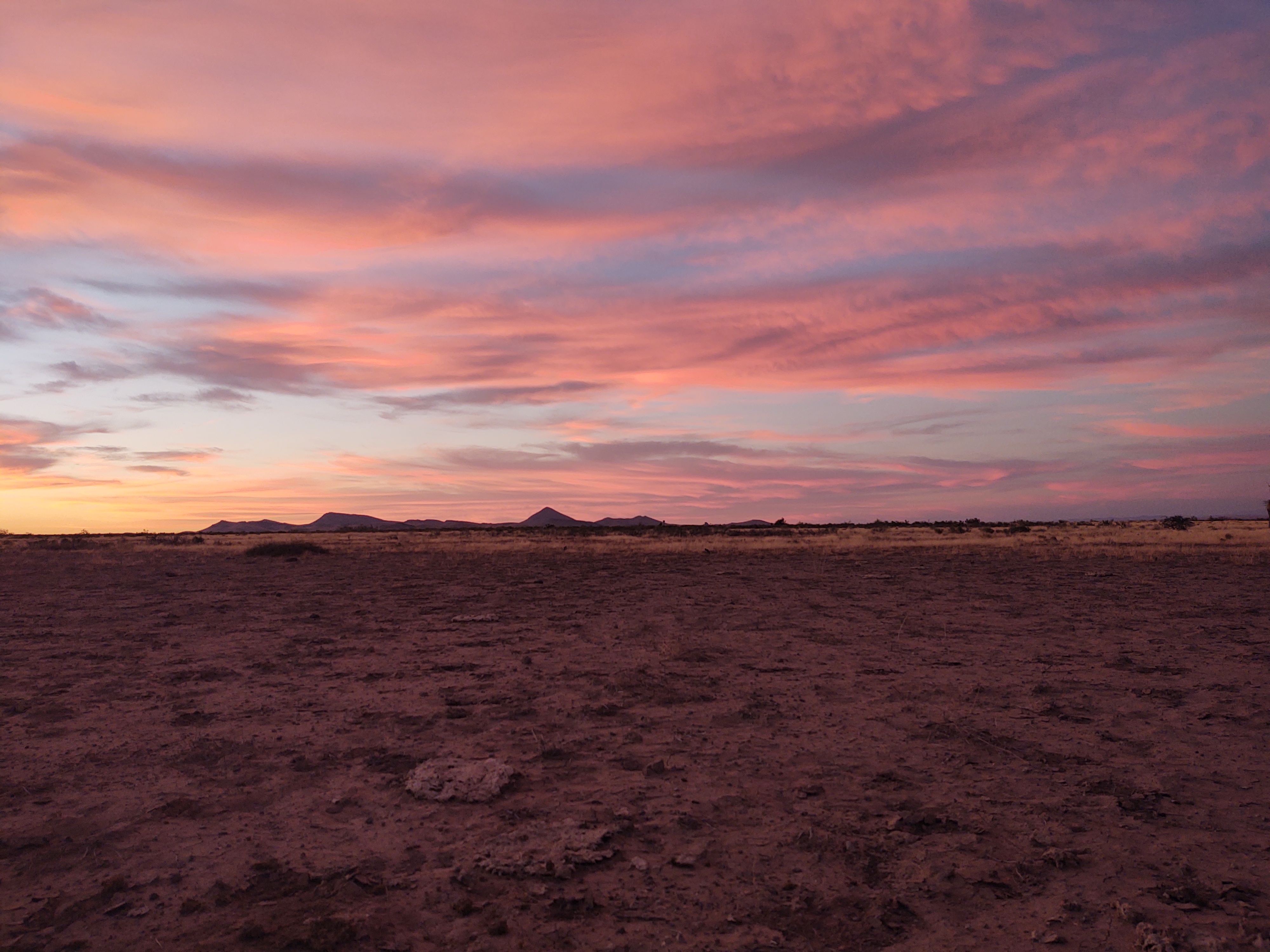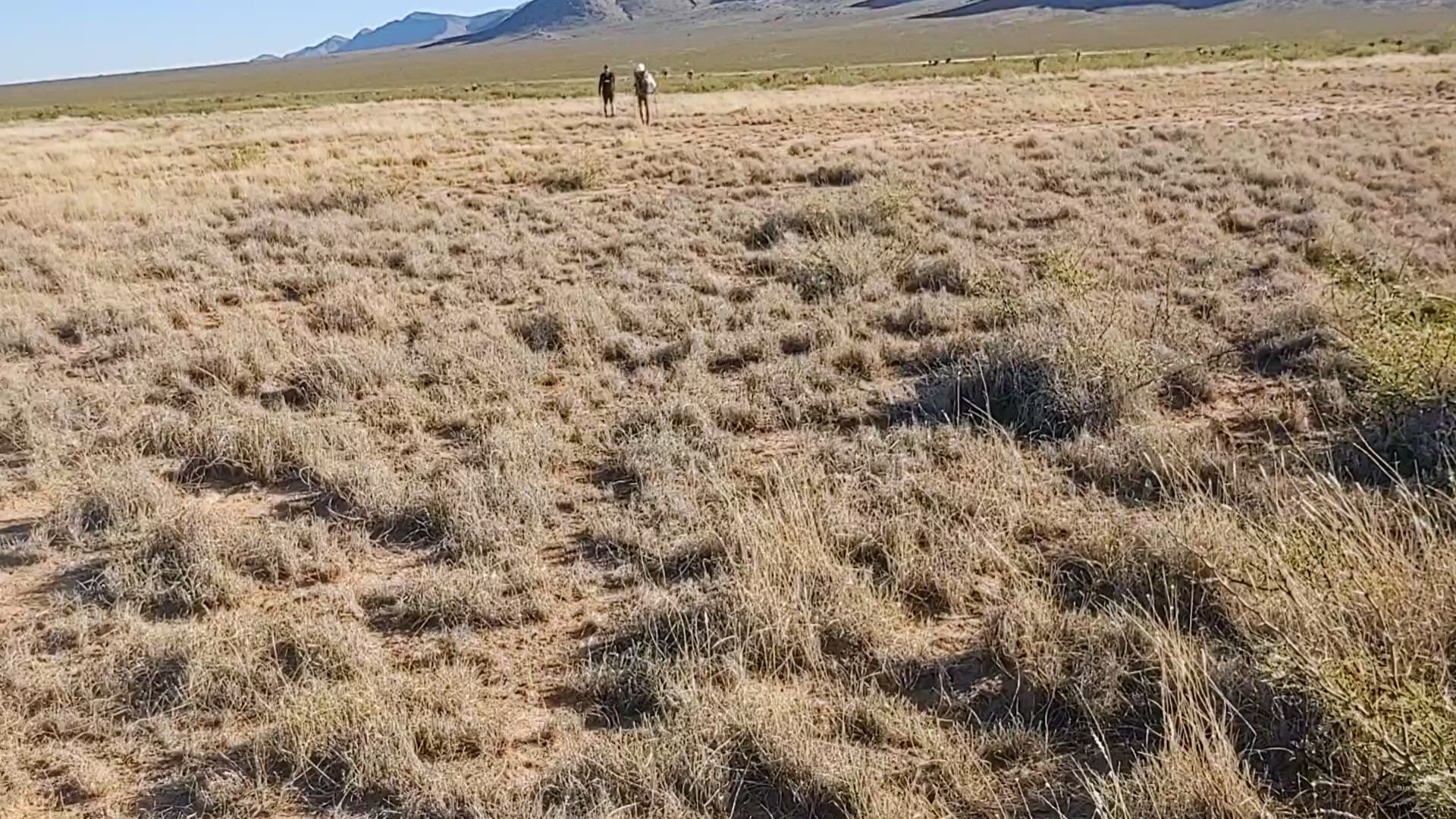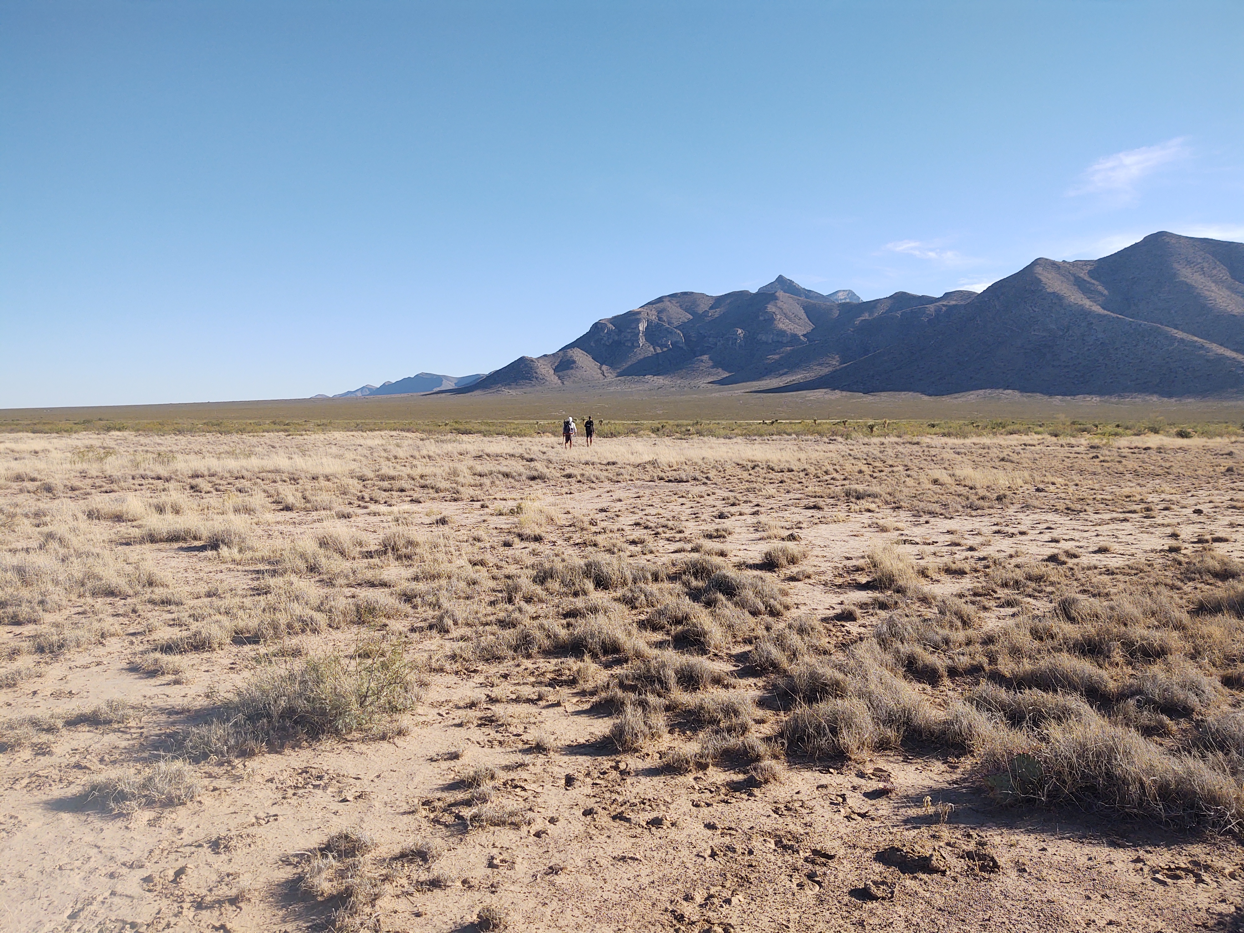 The trail continued along a dry and dusty dirt road. In the distance, little mountain peaks pop up, accentuating how desolate and flat the terrain we are currently walking is.
