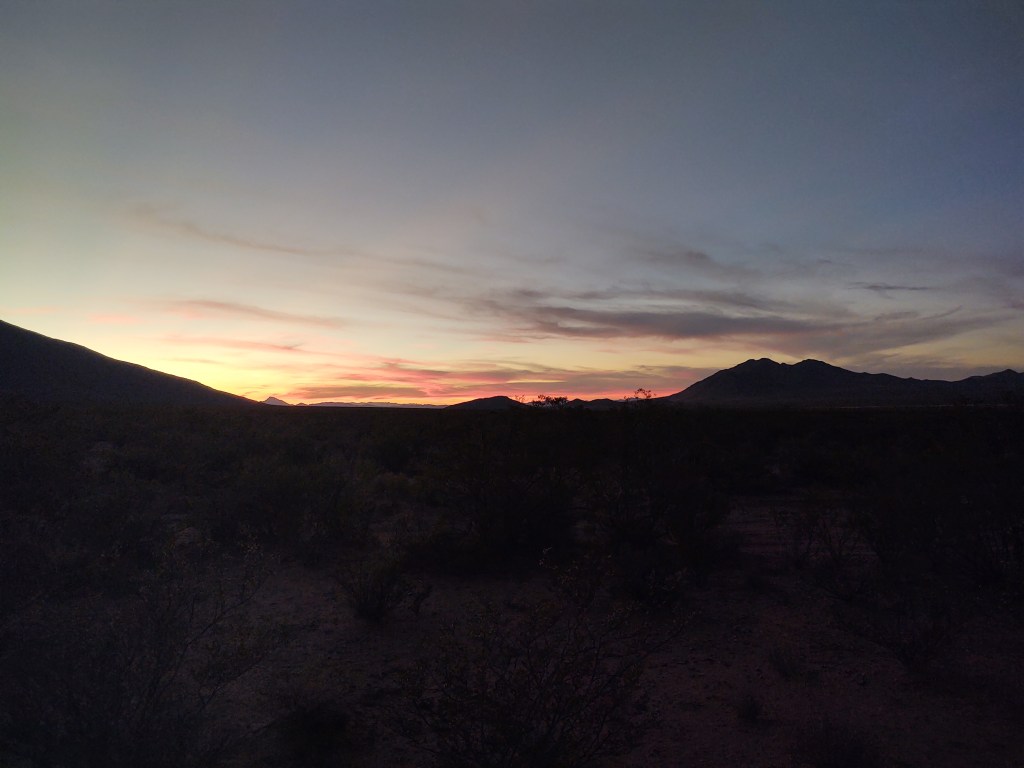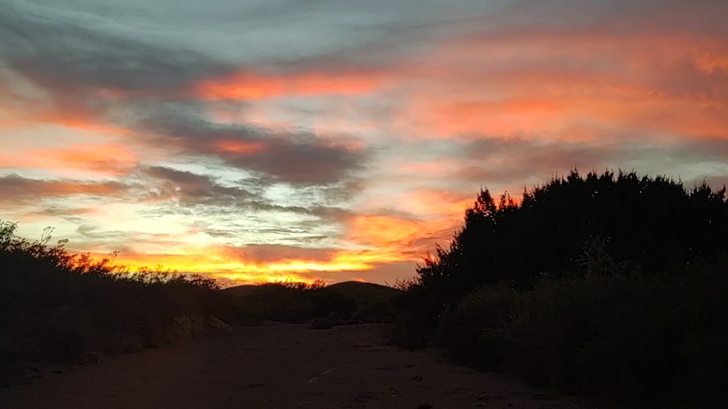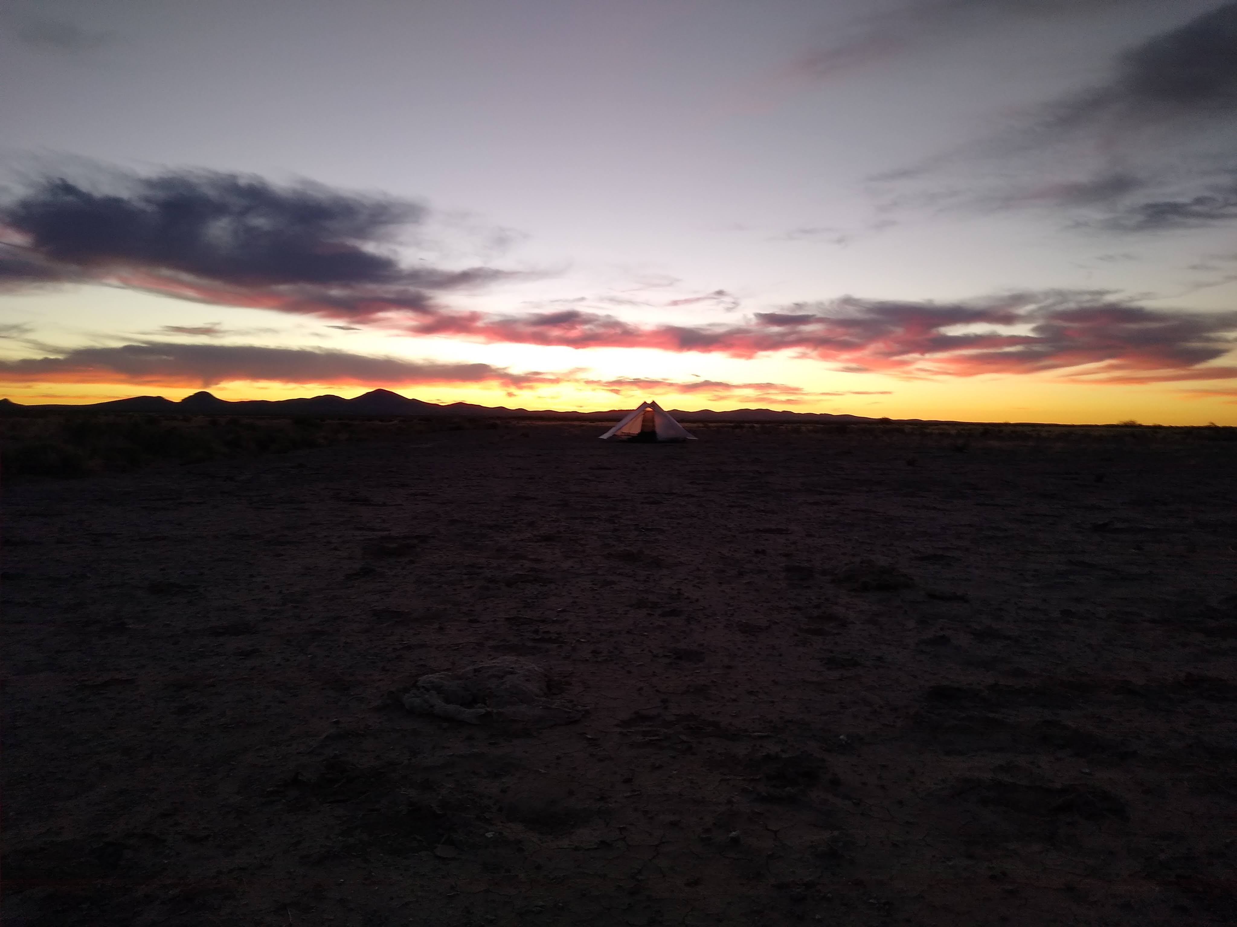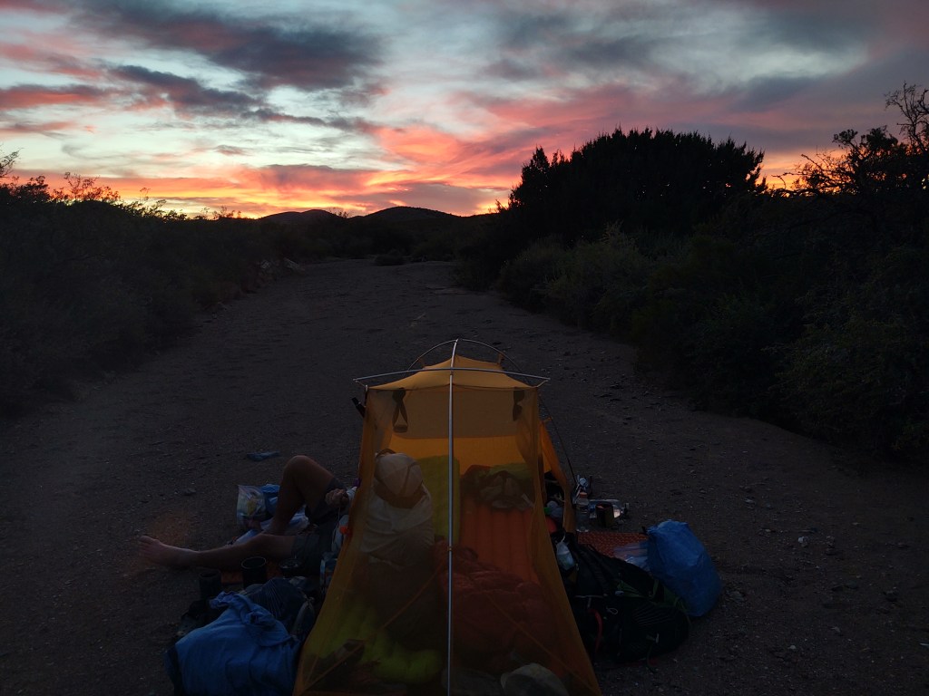 When we reached the portion of the trail that follows a sandy wash, we set up camp. Had there been any inkling, or forecast of rain, for this or the “upstream” area, we wouldn’t have camped there. Our sunset was amazing. Two more nights!