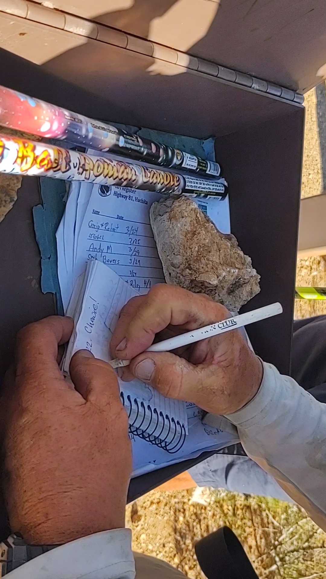 As we were not to particularly in a hurry, and it was only 9:30, we watered up and lounged for a bit. Ray from the EconoLodge stopped by to check the cache on his way to pick up some hikers. We assumed it was the ones who had passed our camp early in the morning the day before. He confirmed that we could walk the road all the way to the monument, and that along said dirt road was a solar windmill with water.
