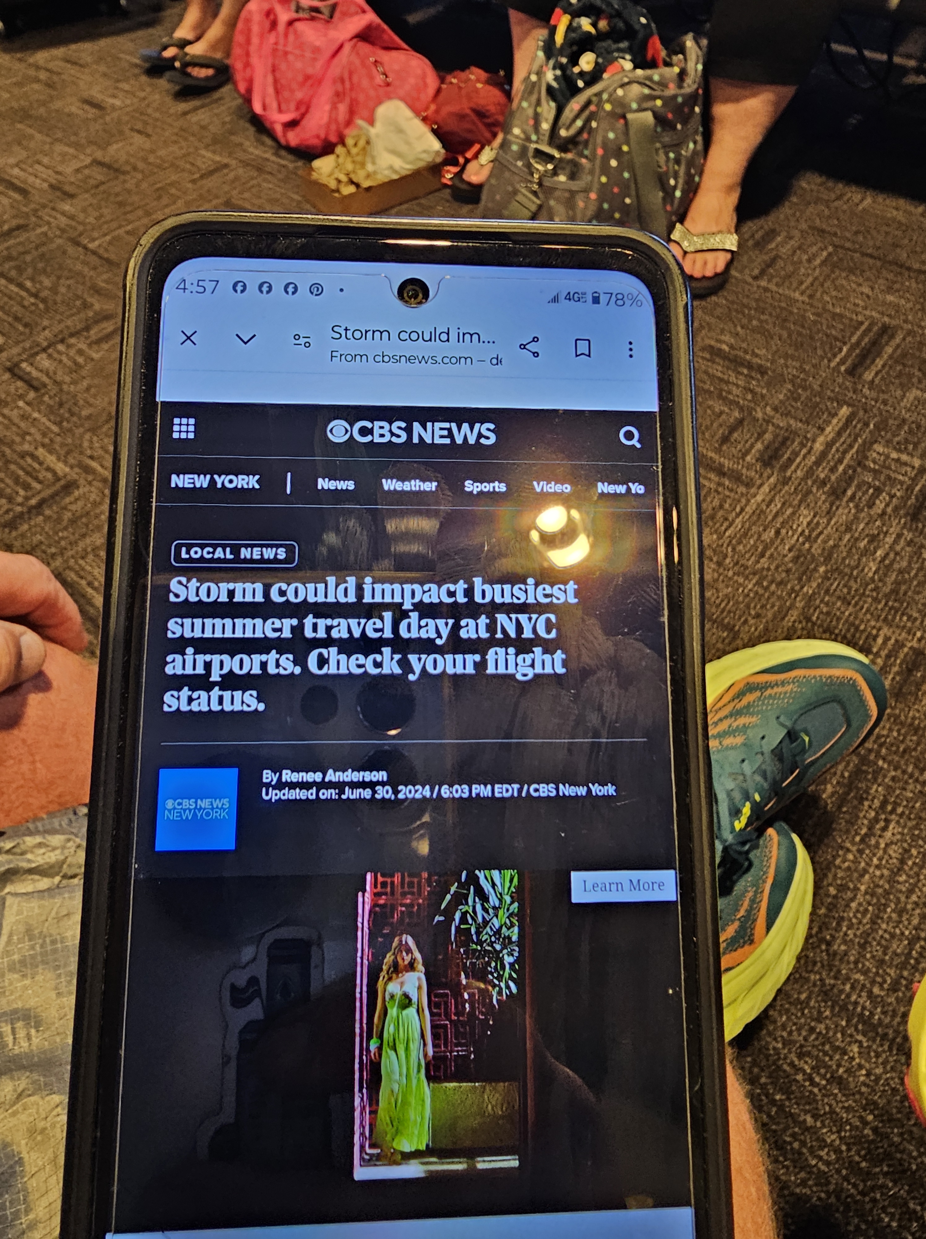 From the transit center, we take the free San Diego Flyer to the airport…where we wait. Flights are delayed due to severe thunder storms back east. New York, to be specific.