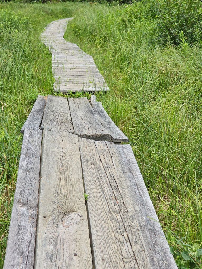 We moved with much more ease across boardwalk lined swamps and pine forest. I made the mistake of letting my mind wander from watching my feet on the trail and suddenly found myself hitting the ground hard upon rolling my left ankle. After a bit of whimpering and inventory, my hike was not over. I was going to be able to walk it off…mostly. By 6pm we were mostly ready to quit. The only problem there was no place to camp, so we pushed on to the Upper Goose Pond Cabin.