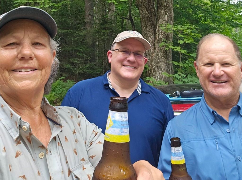 He posted a sign just before the county road crossing. Had a shaded place secure from bugs. Seats upon which to sit. A battery pack to charge your electronics. All manner of trail snacks. AND frosty cold drinks, to include beer! Hmm. Gatorade or beer? We have never been one’s to pass up beer, on trail, regardless of the time of day. So, to Mike’s amazement, we cracked a beer and sat in the bug-free shade and chatted with this amazing trail angel Mike before heading on.