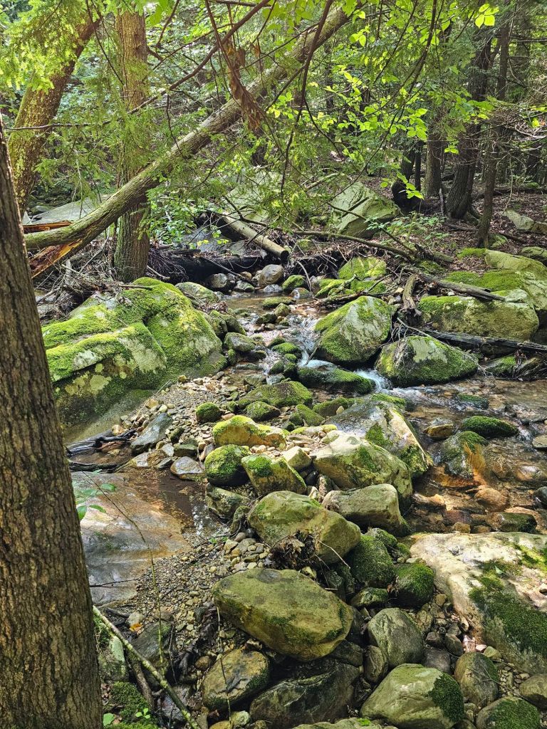 Because my foot was still a bit tender, we opted to take an alternate that would keep us from a big climb and descent. This would shave off 4 miles, but possibly save us from a zero or more once we made it to Manchester. Even so, we still stomped out just under 15 miles, our best day so far. We can’t seem to trek much over 2 mph. Our average is 1.5 – 2, so far. Without trail legs and goat feet, anything averaging 2mph will be impossible with the tread of this trail. With tired feet, and just after a flowing stream, we found a stealth site to camp. There is no way we were going to make that last 1.4 mi to the shelter.
