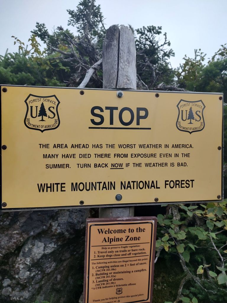When we reached the Madison Spring Hut, they had no vacant bunks to buy and no WFS. Needless to say, I was 100% worked and out of steam. The next place to camp trail was 2 miles away with a 1500 ft descent through a boulder field. Our only choice was a side trail, the Valleyway Trail, which we were told was part of the old AT route, and a USFS campground a half mile down that trail. We decided to take the vintage route. On our way down, this sign was posted just before one would reach the Hut.