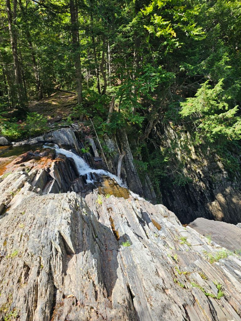 Once resupplied,  we marched our way 3 miles to the Gulf Hagas (The Grand Canyon of Maine) and Hermatige Preserve, Croc hopped across the Gulf Hagas Brook and camped just outside the Preserve. Now, this place was pretty neat, in that it was significant.  The Gulf Hagas is a deep slate Gorge, nearly 500ft deep, where loggers used to toss cut trees for transport to lakes (ponds) for collection to the mills. And, in the Hermatige Preserve, in this specific forest, the trees were coveted and sought after for their girth, length (up to 120′ tall), and their straightness as mast for tall ships through the 1600-1800’s. These masts had to support sails that weighed over 4,000 lbs and took the strength of 20 men to hoist the mainsail. This particular preserve has not been logged for going on 200 years. We couldn’t help but admire those surviving would be masts.