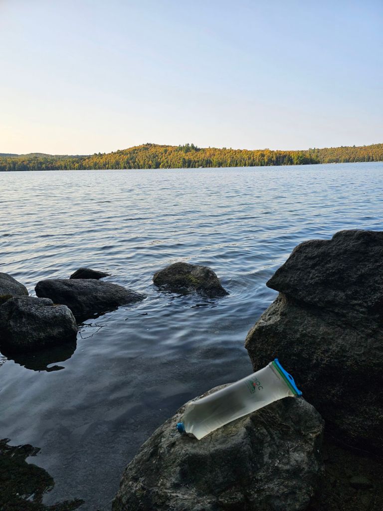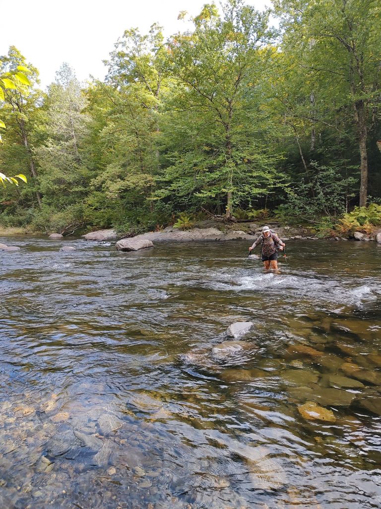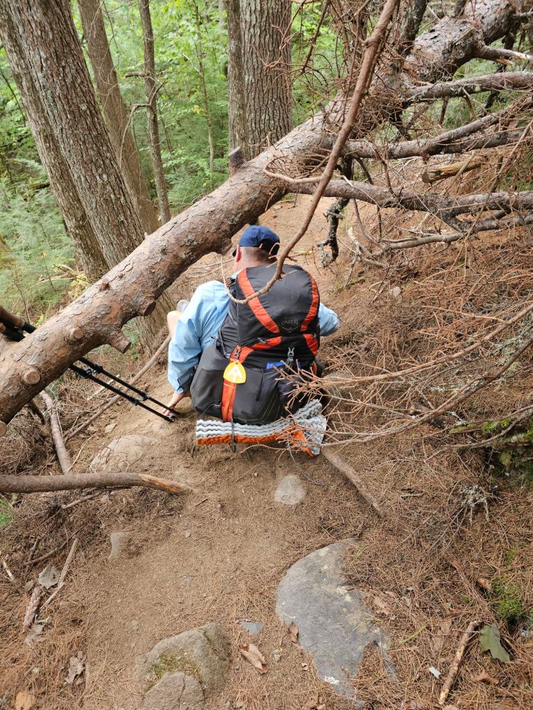 Turns out, the tread was aminable to our quest. Paul actually made it to Jo Mary rd by 1:40pm. I picked up my pace a bit, as the tread continued to be “easy.” Just past Cooper Pond, where I was to swim, and while sitting on a plank over a creek filtering water, who should appear, but Sweat Potato. “Well. We’ll. Well”, was his greeting. Frankly, I was surprised he was even behind us. He looked haggard, and was slowly headed to Jo Mary Rd to also collect a resupply bucket. Collosus, had gone ahead (like Paul) to ensure that someone was there to collect their bucket. Apparently, his allergies were getting the best of him. He didn’t get to sleep until 2 am. when it started to rain. As Tylenol was his only cure, he asked if I had some. I didn’t, but I assured him that Paul did. However, he would be at Jo Mary Rd. This assurance of more Tylenol enabled him to take what he had left. With that, we walked and talked down the trail at pace that surprised Sweat Potato.  Somehow, we walked fast enough to catch up to Collosus,  who we found taking a brief break. By our calculations, we had time to spare and continued our walk and talk all the way to Jo Mary Rd. Miraculously, we arrived by 2:15.