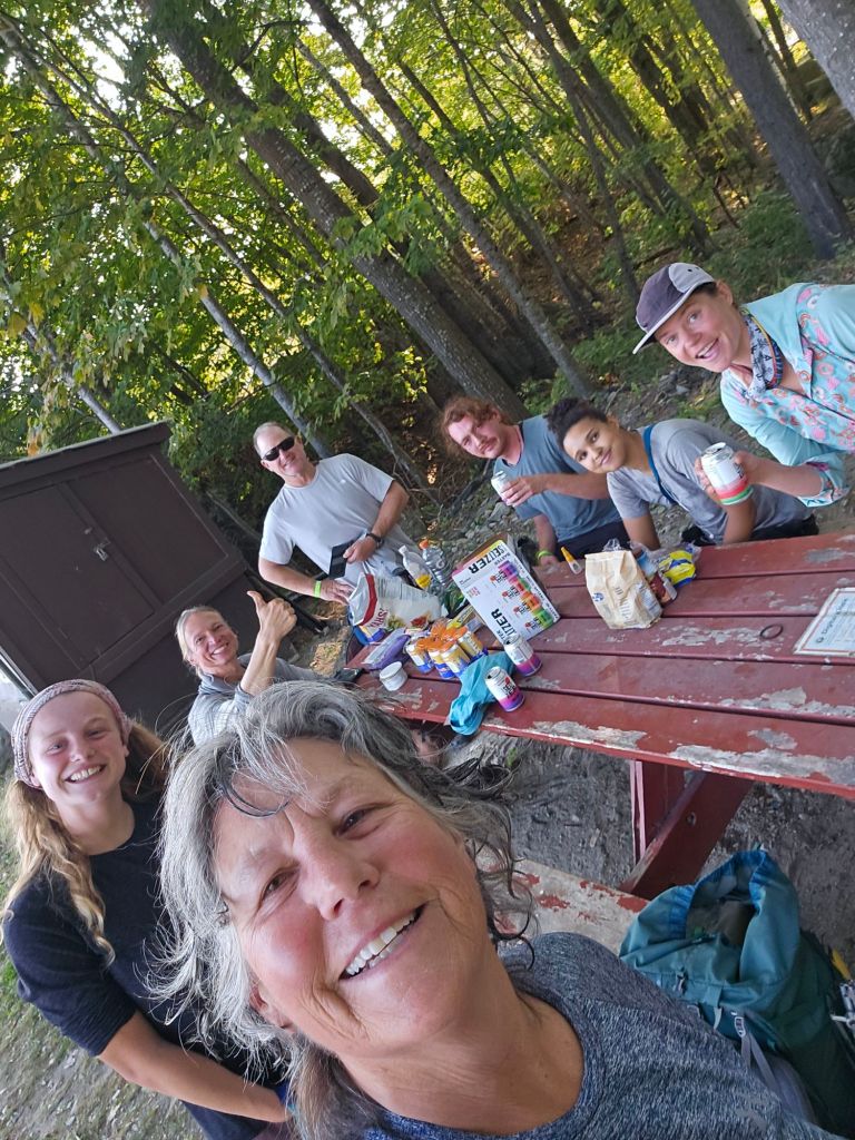 When we stroll up to the Abol Market, we are a little surprised. We are continually finding that what we expect and what we see are widely different. Several other hikers are “rafted up” at the picnic table outside the store. Beer, chips, sandwiches, whoopie pies are splayed on the table. Ranger Donald Duck is briefing everyone on how tomorrow morning’s  campsite “lottery” will go. How early we can line up, and also to assure us that he will find us a place to camp for summiting.
