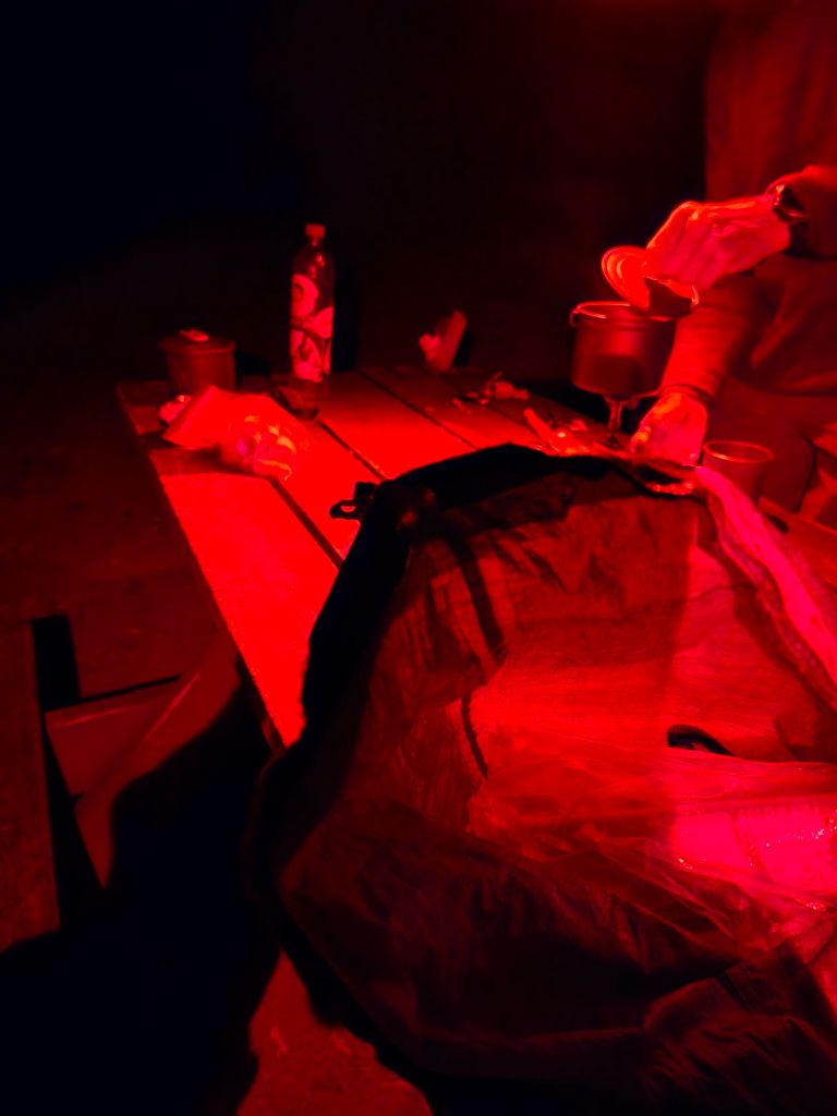 Breakfast is consumed in the glow of red headlamps. Once done, Paul takes the bags to the lean-to, outside the ranger’s office, and I hang the remainder of our food at the bear hang site. It’s go time.