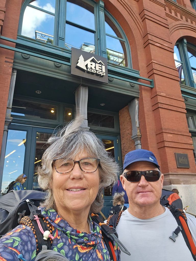 Once the store opens, REI employees allow us to stow our bags inside while we shop. Peakfuel meals, fuel, sleeping bag liner, hat (forgot mine at in Millinocket), water filter replacement, new trekking poles (for Paul), and a new waterproof notepad.